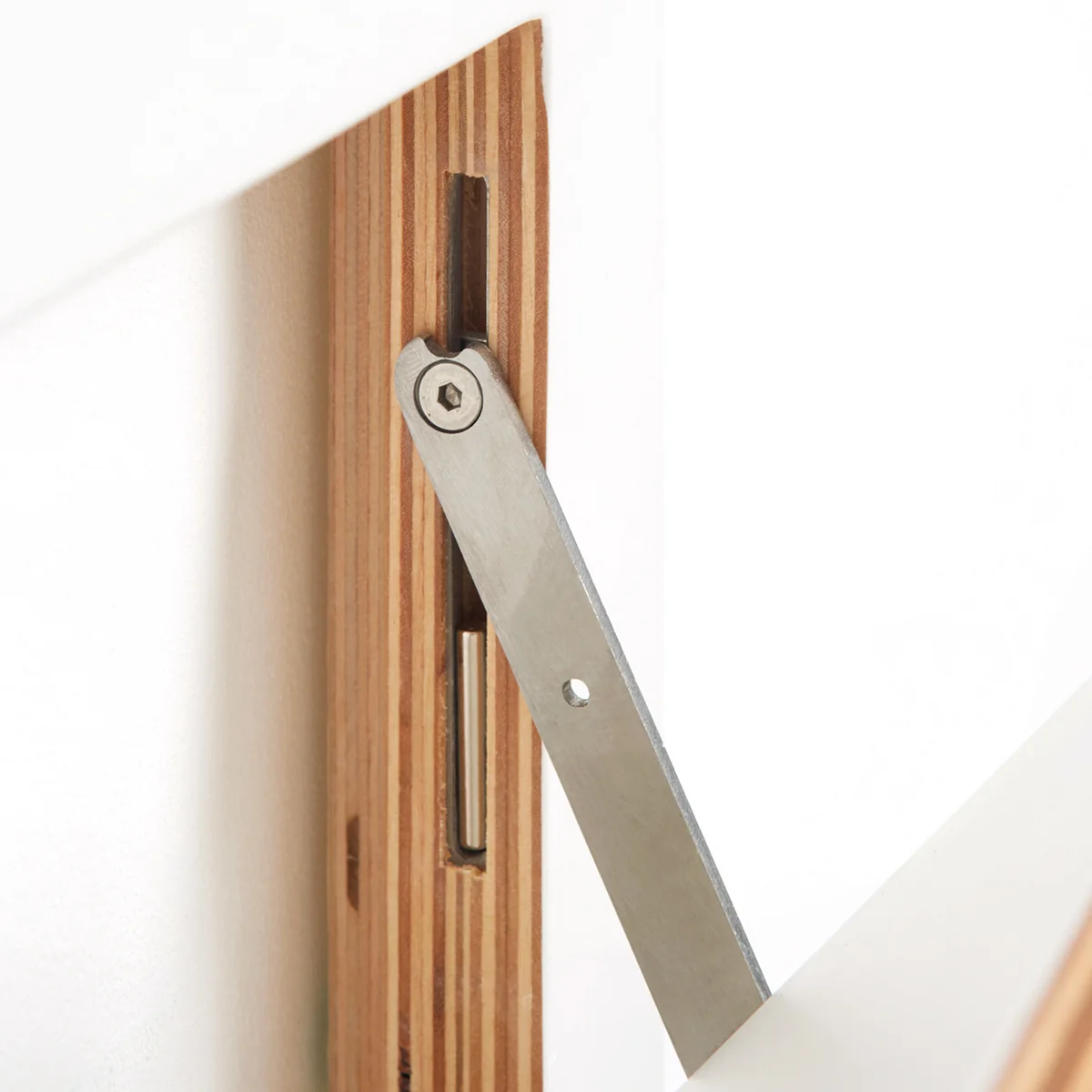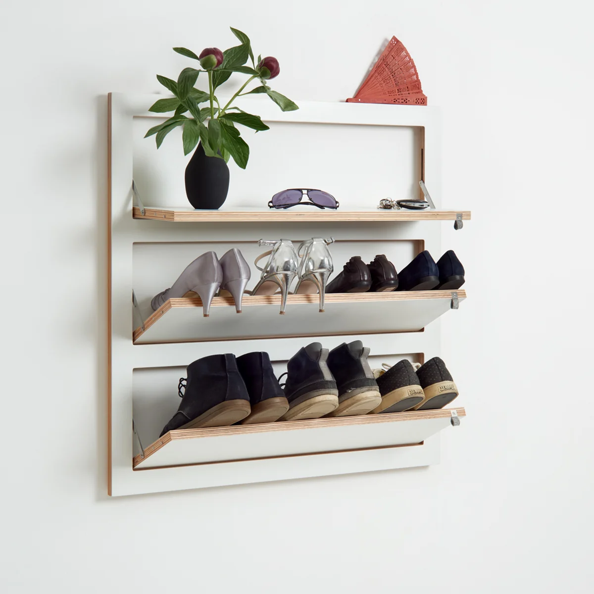 Om een einde te maken aan stapels schoenen onder de kast, kunnen alle wandplanken met weinig diepte worden Fläpps wandplanken met weinig diepte kunnen worden omgevormd tot een schoenenrek. Door magnetische pinnen in de geleidingsrails van de scharnieren te steken, gaan de kleppen van de planken slechts 45 graden open, zodat schoenen en andere dingen die schuin kunnen worden opgeborgen, praktisch kunnen worden opgeborgen.