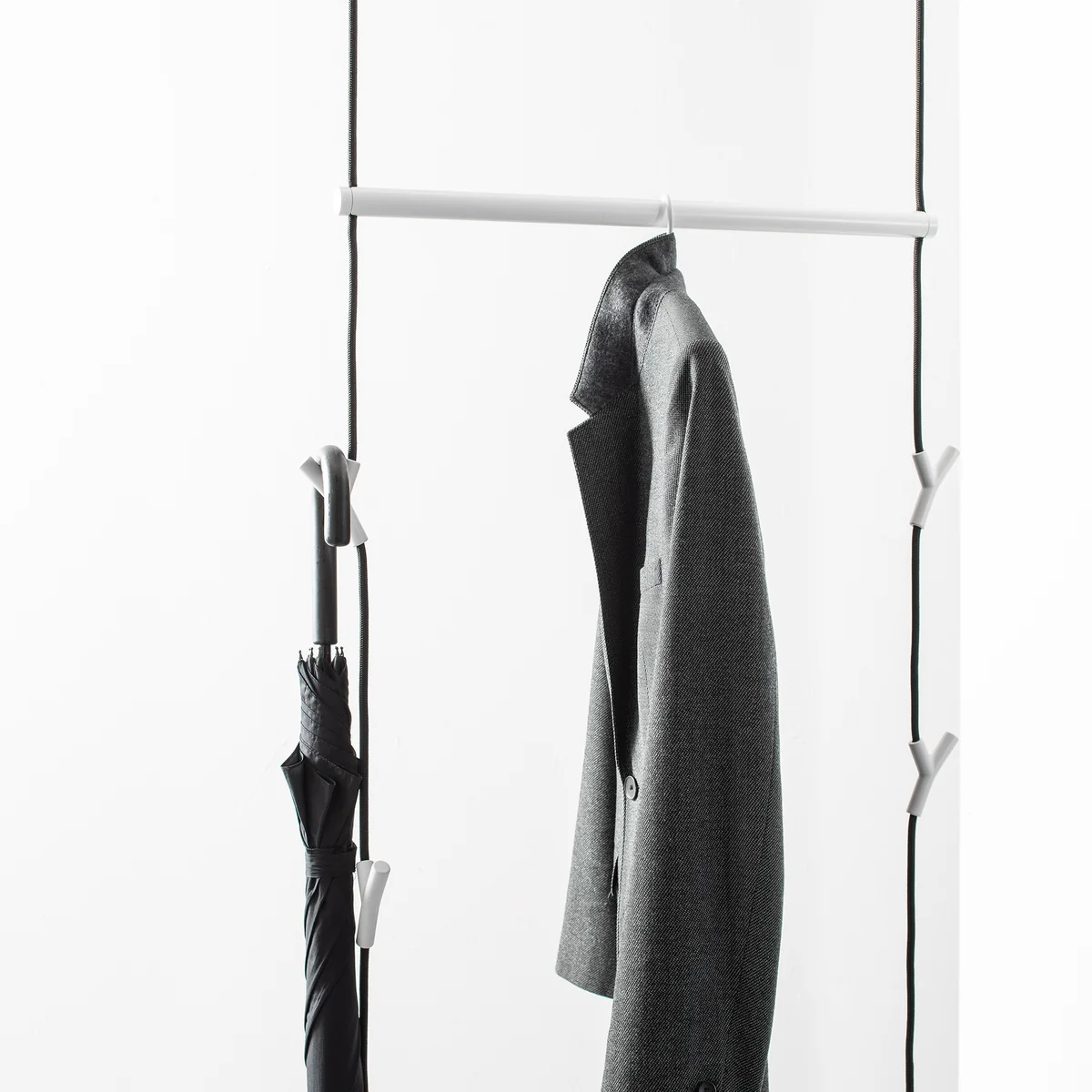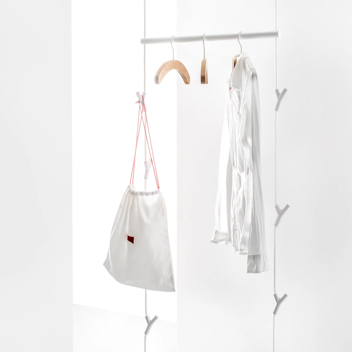 De Wardrope coat rail van Authentics is een moderne en slimme kledingroede. Uitgerust met twee schroeven aan de zijkant, kan het gemakkelijk worden gemonteerd tussen twee Wardrope touwen om een stabiele ophanging voor alle kleding te garanderen. Samen met de touwen biedt het een onvoorstelbaar aantal mogelijkheden om de garderobe te variëren.