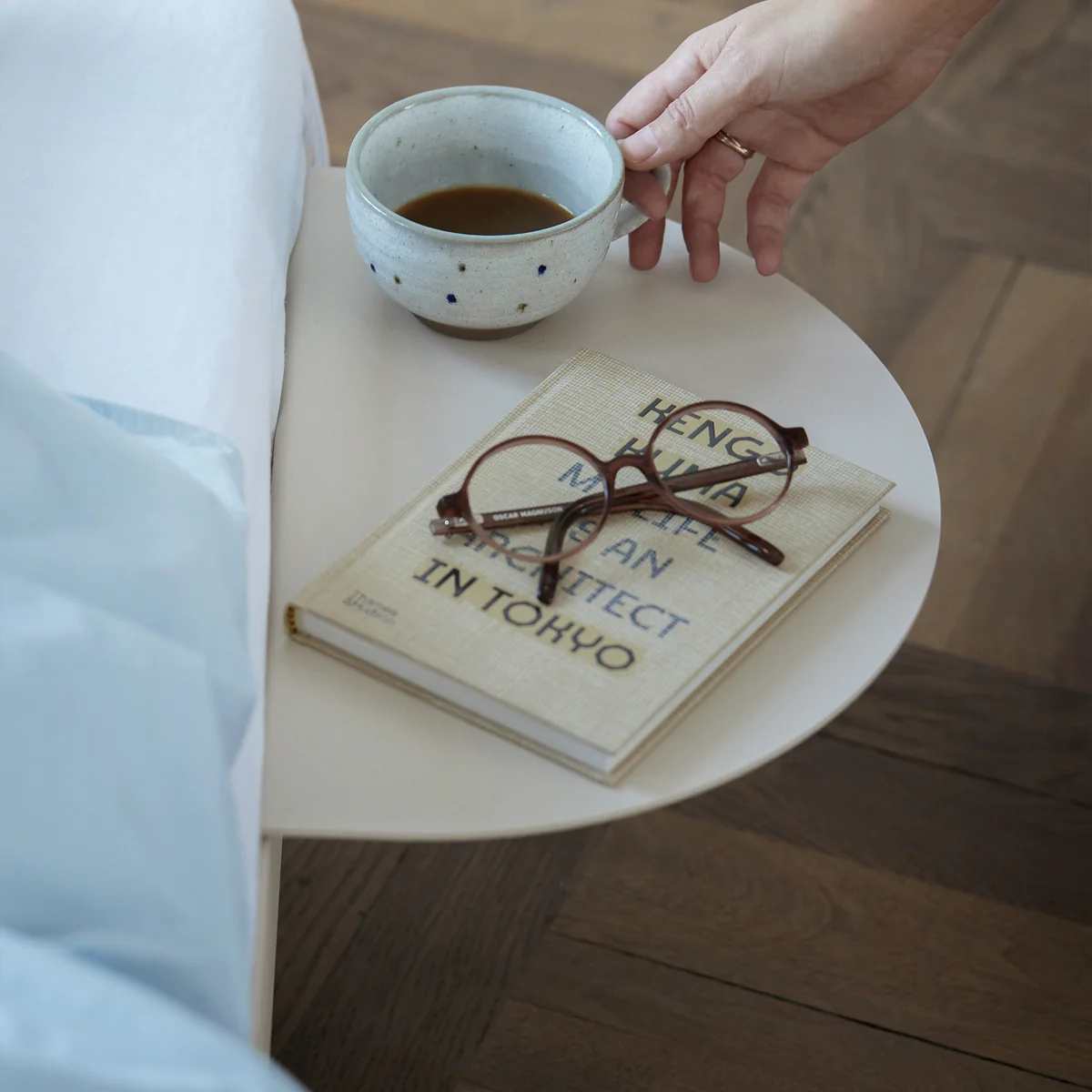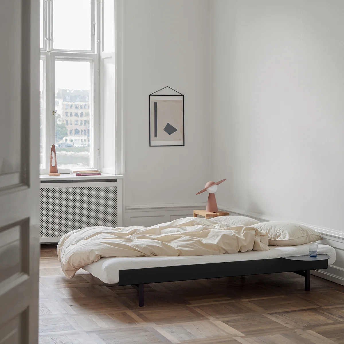 Het nachtkastje kan optioneel aan het bed worden bevestigd vanaf Moebe . Dit kan in kleur worden afgestemd op het bedframe en is ook gemaakt van gepoedercoat staal.