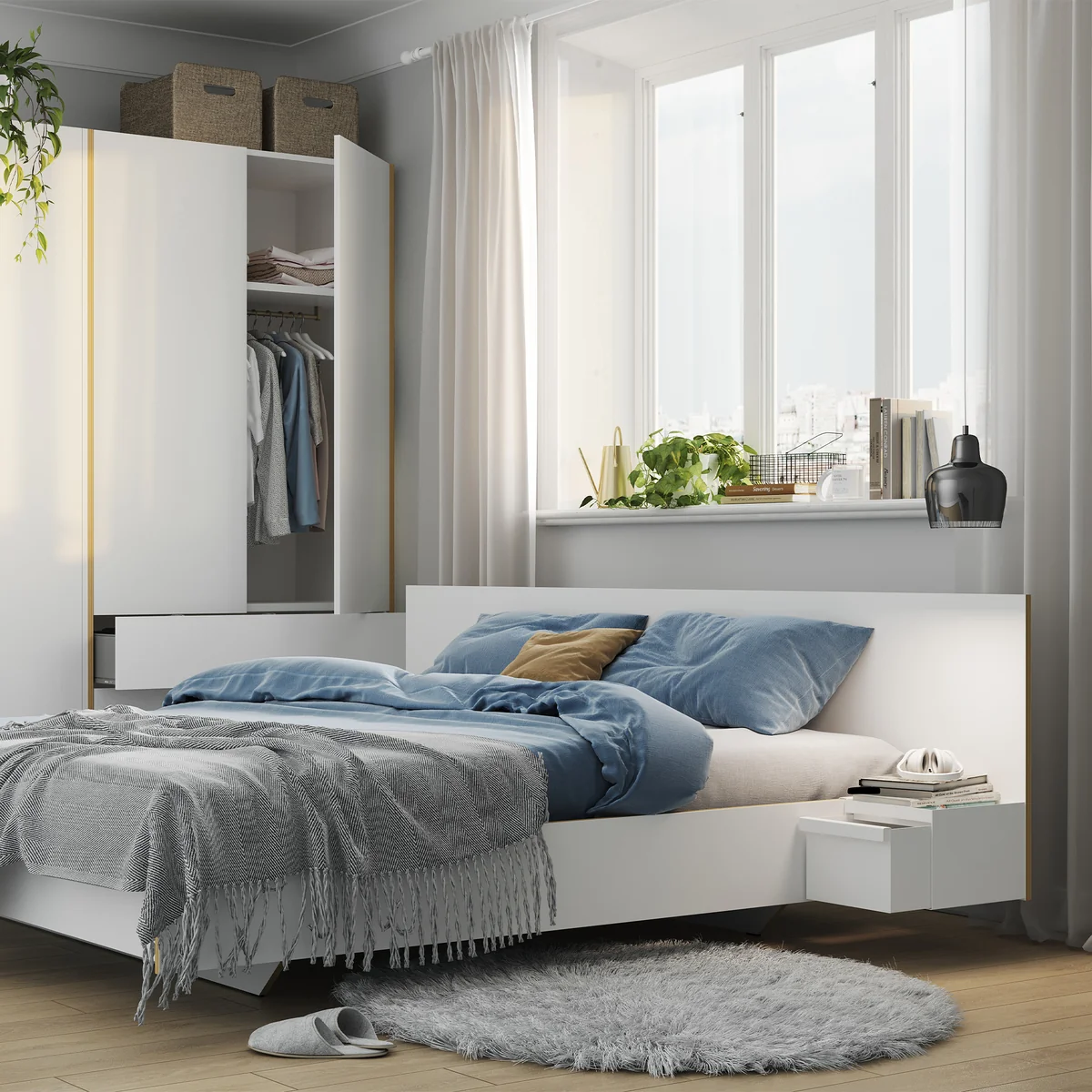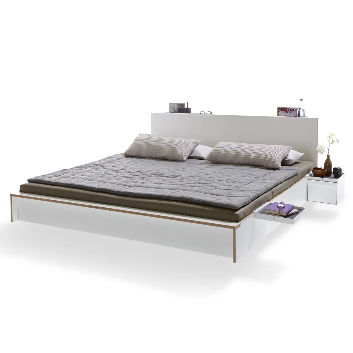 Het minimalistisch vormgegeven bed kan worden aangevuld met het bijpassende hoofdeinde, zodat u comfortabel achterover kunt leunen terwijl u leest.