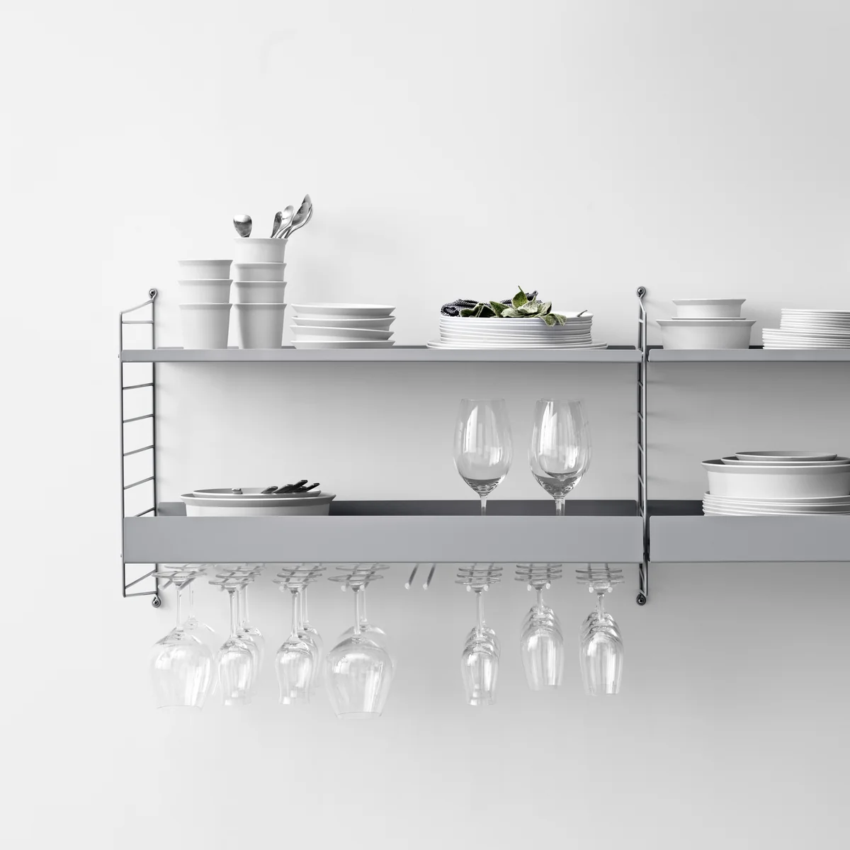 Hanger Rack Met de module voor wijnglazen kan String perfect geïntegreerd worden in bijvoorbeeld de keuken. De gewenste glazen worden ondersteboven aan de steel tussen de metalen vorken gehangen.