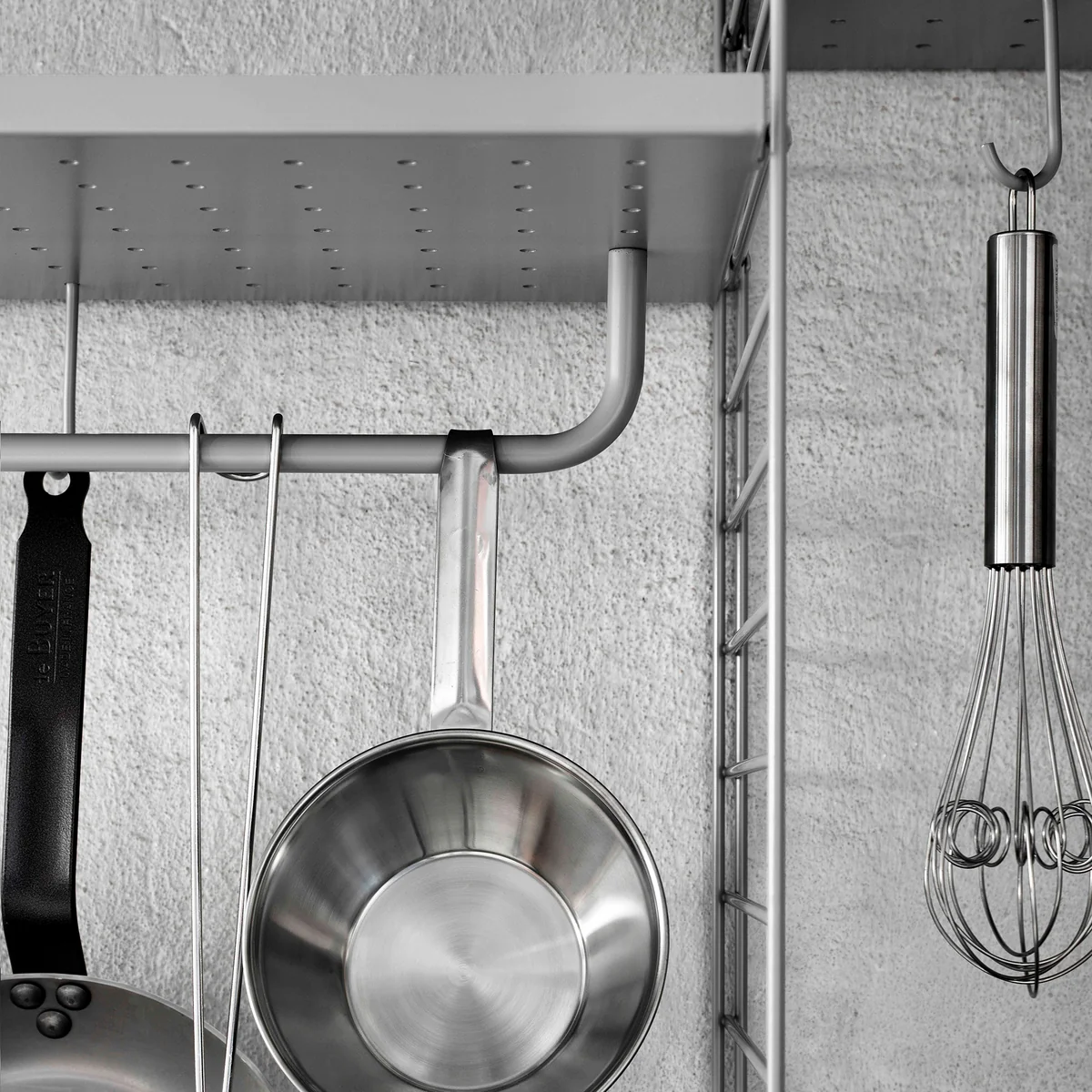 De String stang wordt een kapstok met de praktische metalen String planken, waaraan tassen, jassen, paraplu's en mantels kunnen worden opgehangen aan talloze hangers. De stang is bijzonder praktisch wanneer het String-systeem als kapstok in de gang of slaapkamer wordt gebruikt, maar de stang is ook bijzonder praktisch in de keuken of badkamer. Handdoeken of kookgerei kunnen gemakkelijk onder de planken worden gehangen.