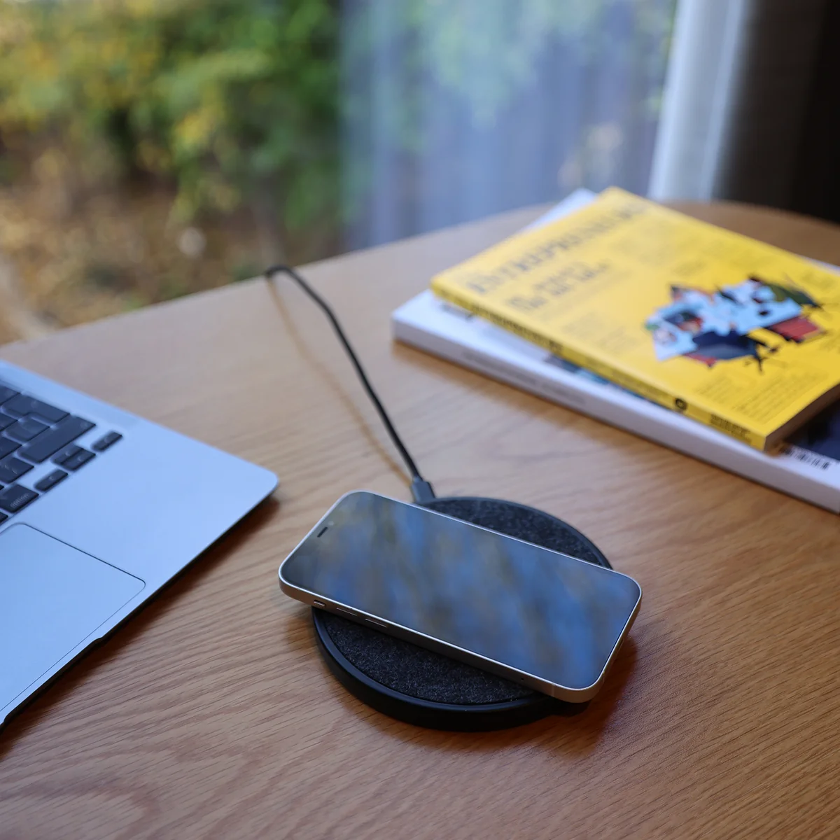 De Accessory Wireless Charger van Tala is een zeer functionele tech gadget voor elk modern huishouden. De draadloze oplader bestaat uit een gepoedercoate stalen voet, die bekleed is met donker vilt en rubberen details. De geïntegreerde USB-C kabel (lengte: 1 meter) kan prachtig geplaatst worden op verschillende bijzettafels, nachtkastjes of bureaus. De draadloze oplader is compatibel met Qi opladen en kan worden gebruikt met apparaten zoals smartphones, tablets of koptelefoons.