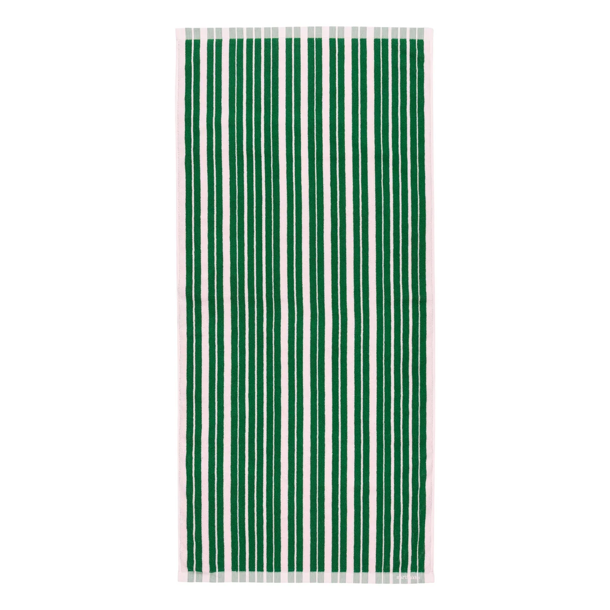 Deze badhanddoek van zachte biokatoenen badstof combineert comfort met tijdloos design. Het Raide-patroon, ontworpen door Annika Rimala en geïnspireerd op treinsporen, geeft de handdoek een dynamische en handgetekende look.