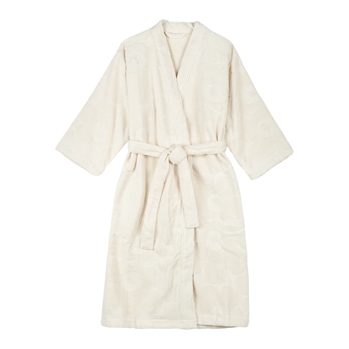 Marimekko De Pienni Unikko badjas van harmonieert comfort en iconisch design. Hij is gemaakt van zachte biokatoenen badstof en versierd met het beroemde Pienni Unikko dessin, dat bloemige elegantie combineert met moderne esthetiek. De badjas heeft ruime zakken en een afneembare ceintuur voor een comfortabele pasvorm.
