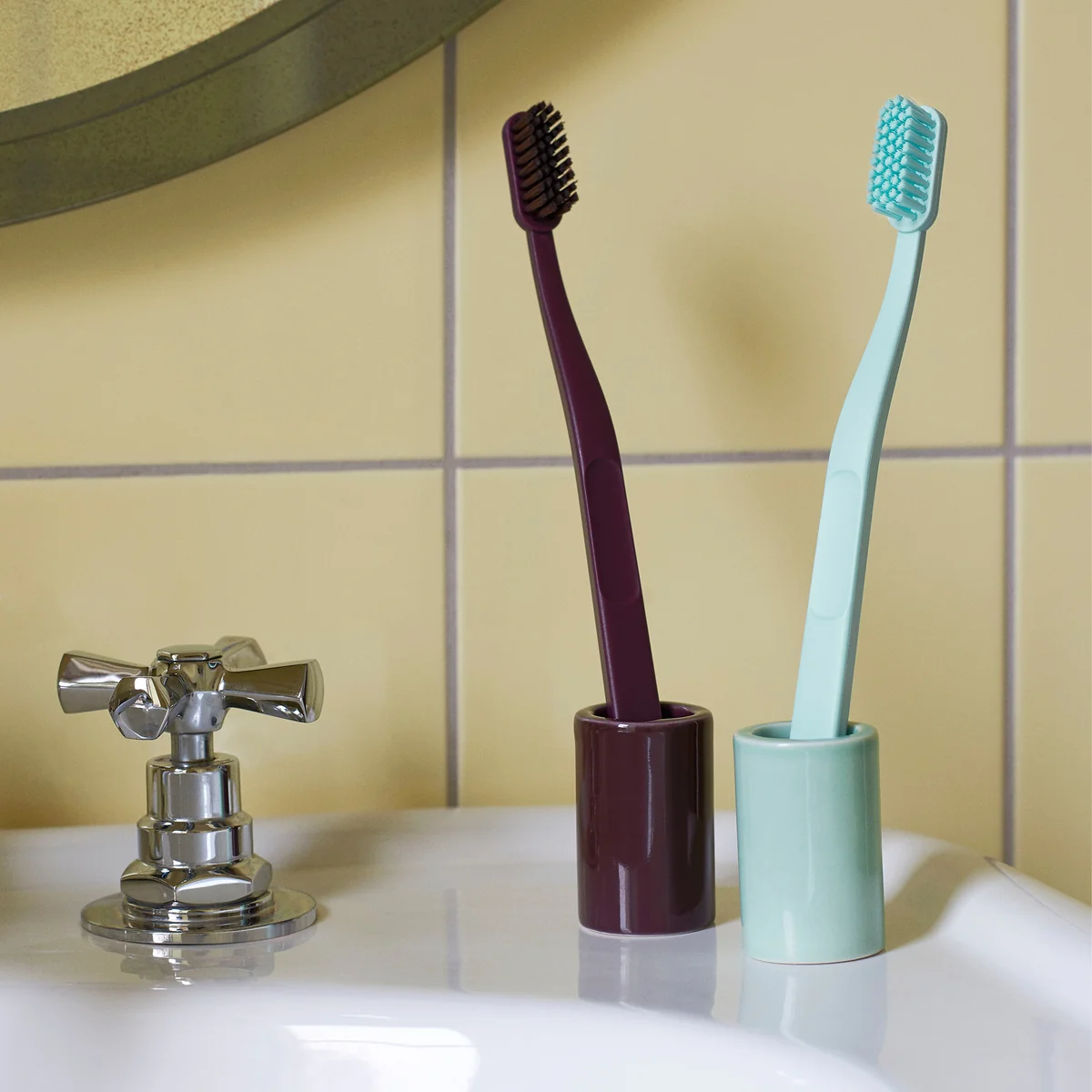 De tandenborstelhouder van HAY brengt kleur in de badkamer. Tandenborstels kunnen optimaal worden bewaard en smaakvol worden gepresenteerd in de functionele en stijlvolle steengoedcontainer, zoals deBamboo Toothbrush van ontwerper Leon Ronsmeier.