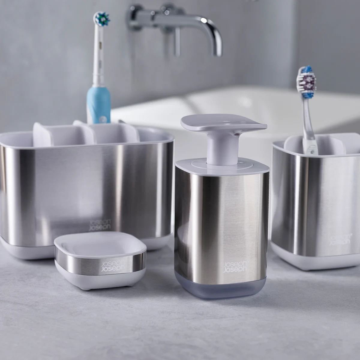 De EasyStore Steel Tandenborstelhouder van Joseph Joseph is een geweldige aanvulling op de badkamer en biedt ruimte voor tandverzorgingsproducten zoals een tandenborstel, tandpasta of flosdraad. Dankzij de verschillende compartimenten kan de container gemakkelijk worden verdeeld onder familieleden of huisgenoten, zodat iedereen zijn eigen ruimte heeft.