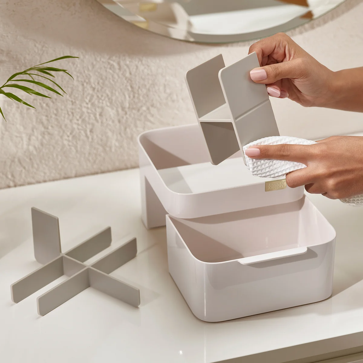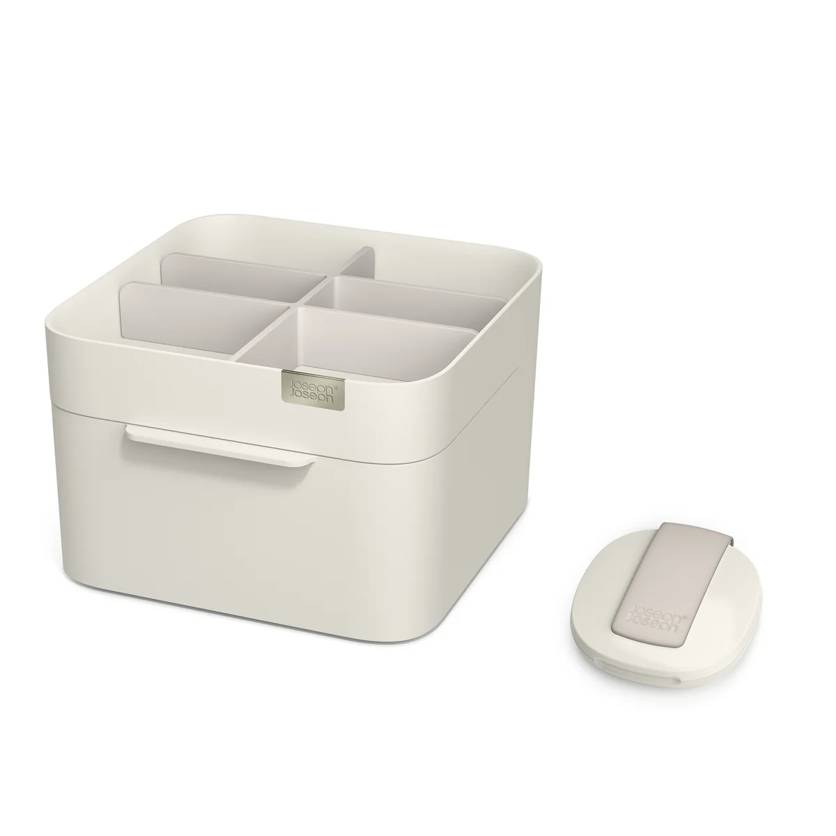 Met de Make Me up set van Joseph Joseph wordt je dagelijkse schoonheidsritueel een georganiseerde en stijlvolle ervaring. De cosmetica-organiser met lade heeft diepe vakken die perfect zijn voor kwasten, mascara en oogpotloden, en ondiepe vakken voor kleinere schatten zoals lippenstiften, blush en oogschaduw. De lade zelf is voorzien van een magnetische sluiting waarin wattenschijfjes, wattenstaafjes en make-up sponsjes veilig kunnen worden opgeborgen. Het chromen embleem voegt een vleugje elegantie toe aan deze organizer, en het mooiste is dat hij gemakkelijk uit elkaar gehaald kan worden om schoon te maken.