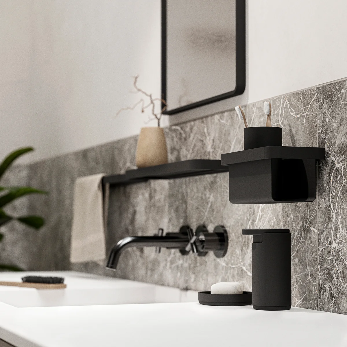De Rim tandenborstel tuimelaar van Zone Denmark maakt indruk met zijn lange, slanke ontwerp. De elegante tandenborstel-tuimelaar is gemaakt van een materiaalcombinatie van aluminium en ABS kunststof. De tandenborstel-tuimelaar kan zowel klassiek voor het opbergen van tandenborstels worden gebruikt als omgebouwd. Op die manier kunnen bijvoorbeeld make-upkwasten perfect worden opgeborgen.