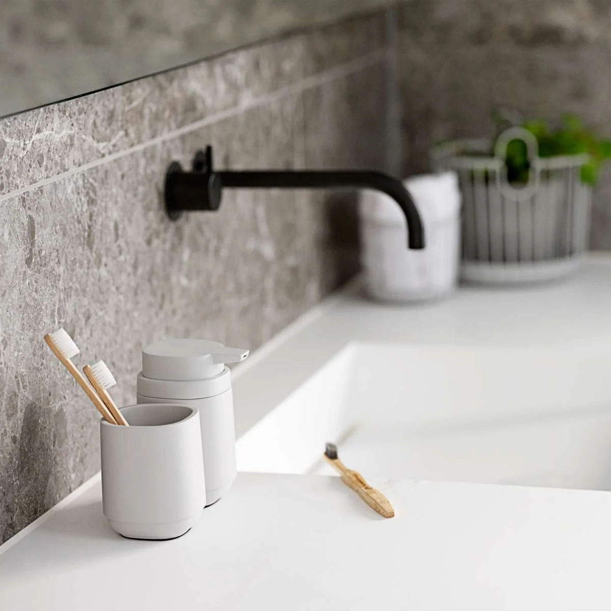 Hij is verkrijgbaar in de neutrale kleuren zwart, zachtgrijs en beton, die een veelzijdige keuze bieden. De beker biedt voldoende ruimte voor tandenborstels, tandpasta en andere badkamerbenodigdheden. Dankzij het stevige en stabiele ontwerp blijft de tandenborsteltrommel stevig op de wastafel of het schap staan. Zone Denmark De - Time tandenborsteltrommel is een praktische en esthetische toevoeging aan uw badkamer en zorgt voor orde en stijl in uw dagelijkse verzorgingsritueel.