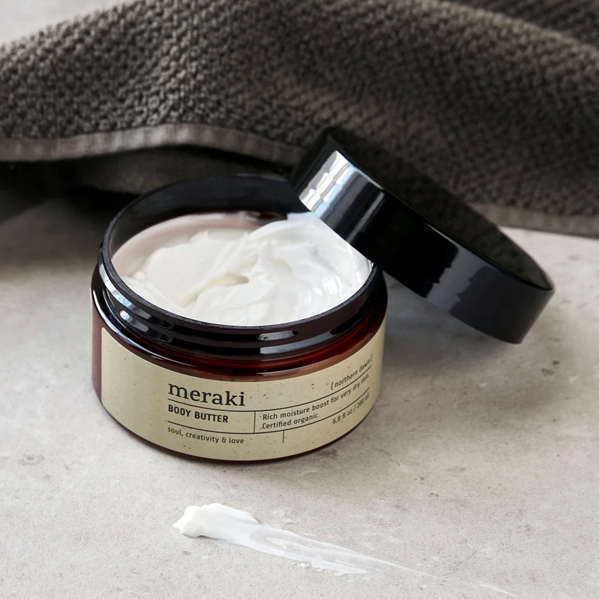 Meraki Deze gecertificeerde biologische body butter van, verkrijgbaar in verschillende versies, voorziet de huid intensief van vocht zonder vettig aan te voelen. De droge huid wordt gevoed en beschermd tegen uitdroging door een combinatie van aloë vera, sheaboter en voedende olijf-, zonnebloem- en amandelolie. Het resultaat is een zachte, soepele en diep gevoede huid. Elke versie beschermt de huid tegen uitdroging.