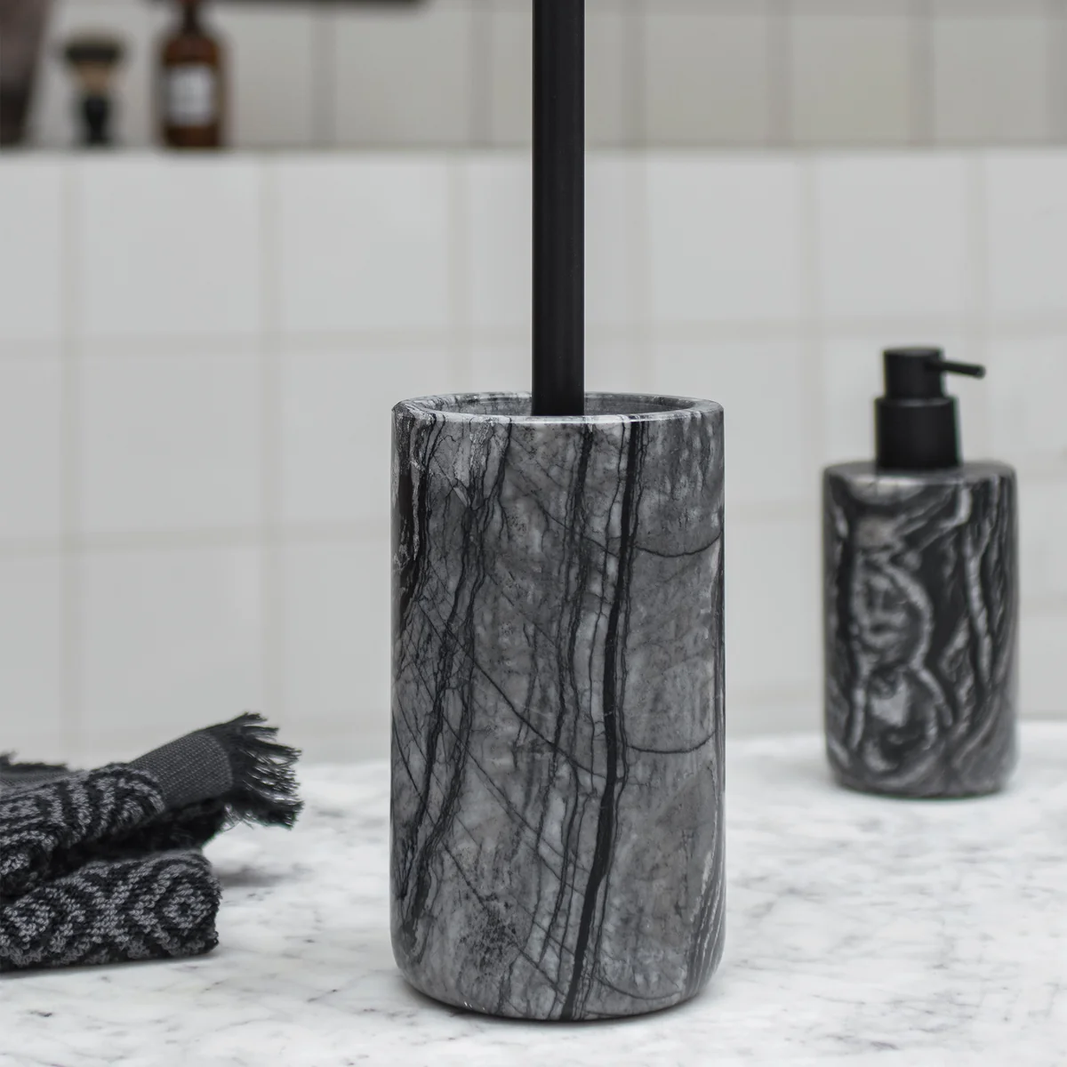 Het gebruik van donker marmer geeft de toiletborstel een elegante en tijdloze uitstraling. Het marmer kan verschillende natuurlijke aders en kleurtinten hebben, waardoor elk stuk uniek is.
