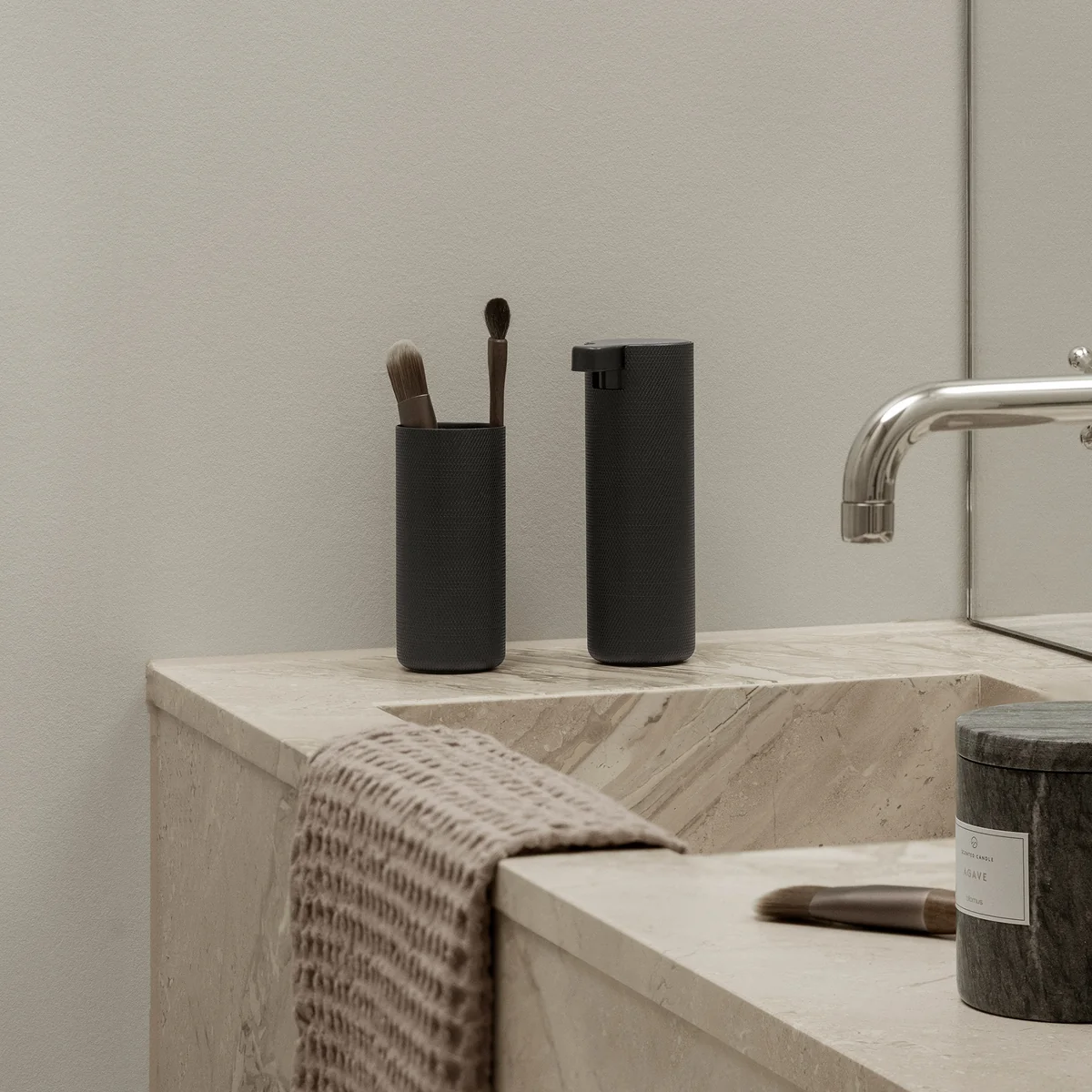 De zeepdispenser is gemaakt van titanium gecoat roestvrij staal en is corrosiebestendig, krasvast en extreem duurzaam. Met een capaciteit van 165 ml biedt het een betrouwbare en stijlvolle opslag voor vloeibare zeep. De duidelijk gevormde, klassieke cilinder en de harmonieus afgeronde behuizing vormen een perfecte aanvulling op de Modo-serie. De grote, gebruiksvriendelijke "kop" fungeert als een drukknop die op betrouwbare wijze een portie vloeibare zeep afgeeft. De rubberen onderkant garandeert een stevige stand en beschermt badkamermeubels tegen krassen en schuren.