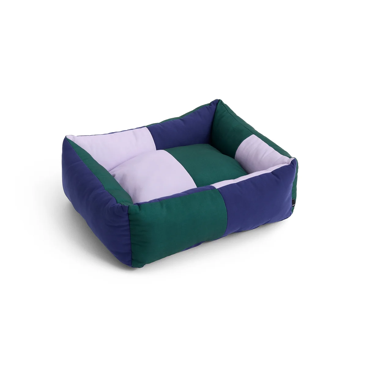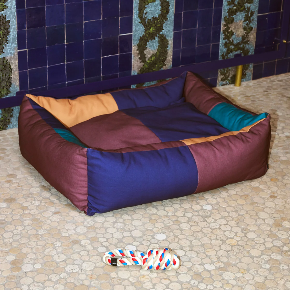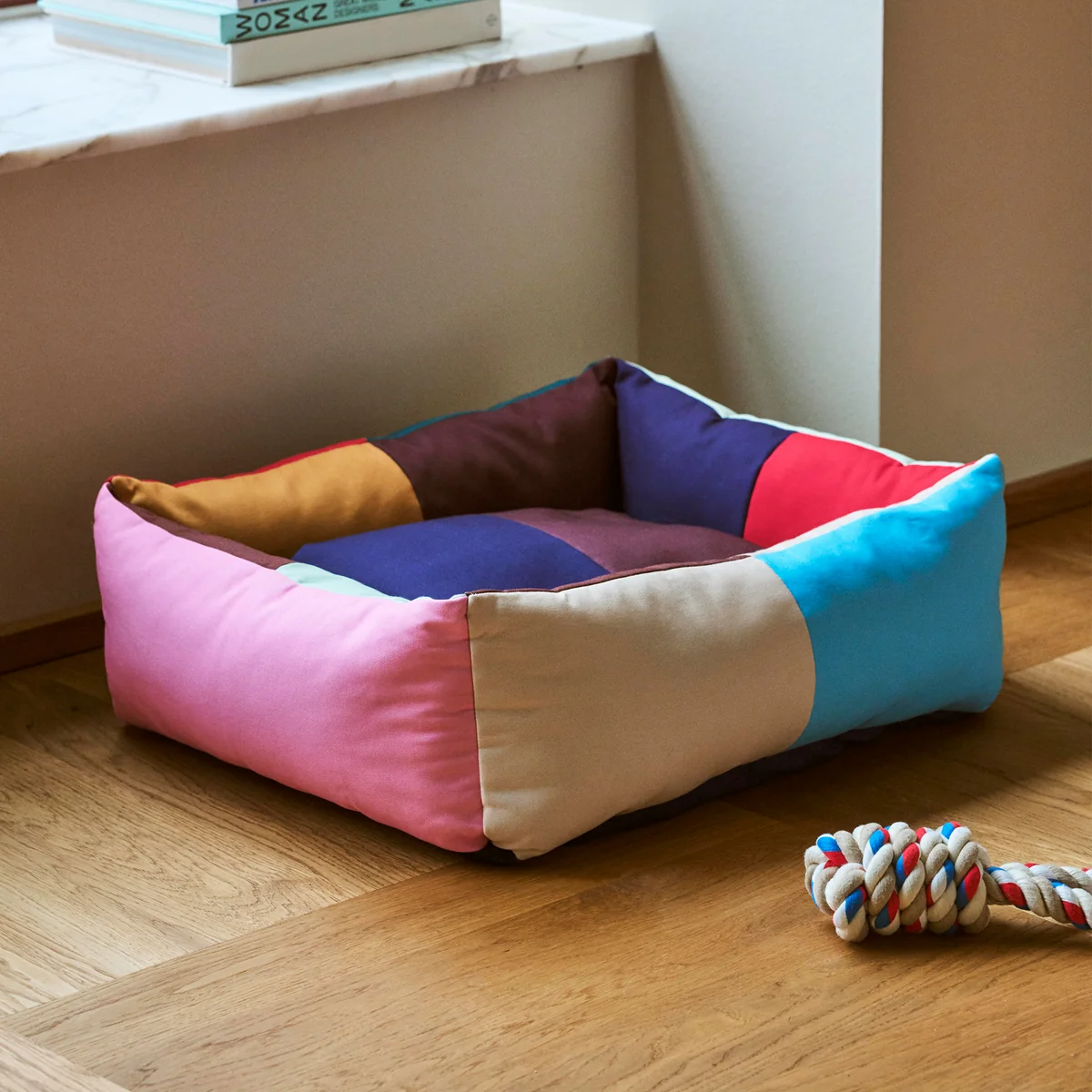 Het hondenbed met zijn speelse kleurblokdesign is gemaakt van robuust, gerecycled polyester en een wasbaar, verwijderbaar kussen gevuld met gerecycled polyester. Het bed is verkrijgbaar in drie verschillende maten in verschillende designs.