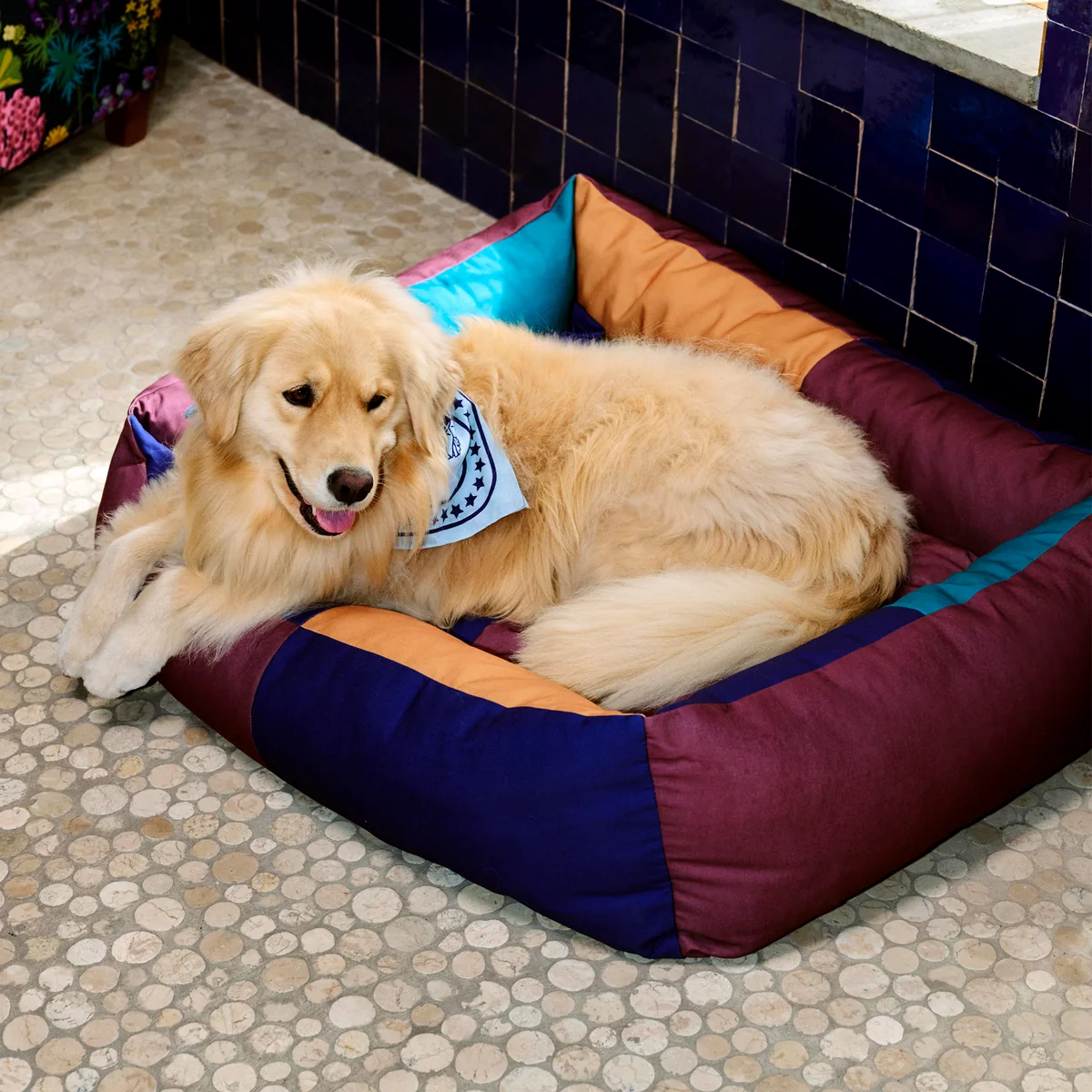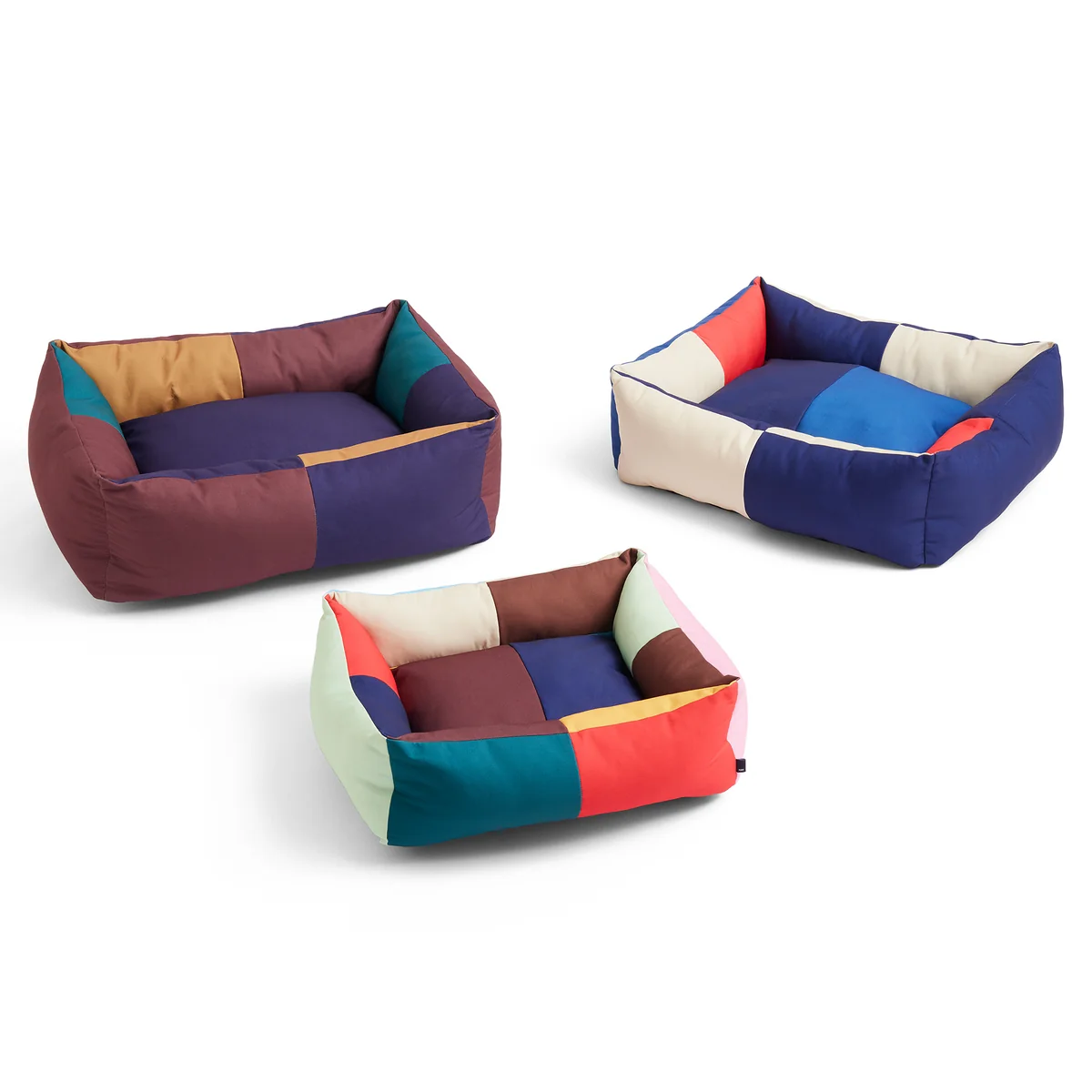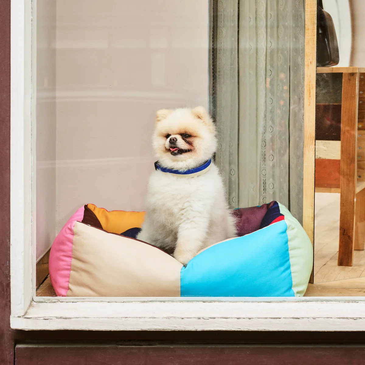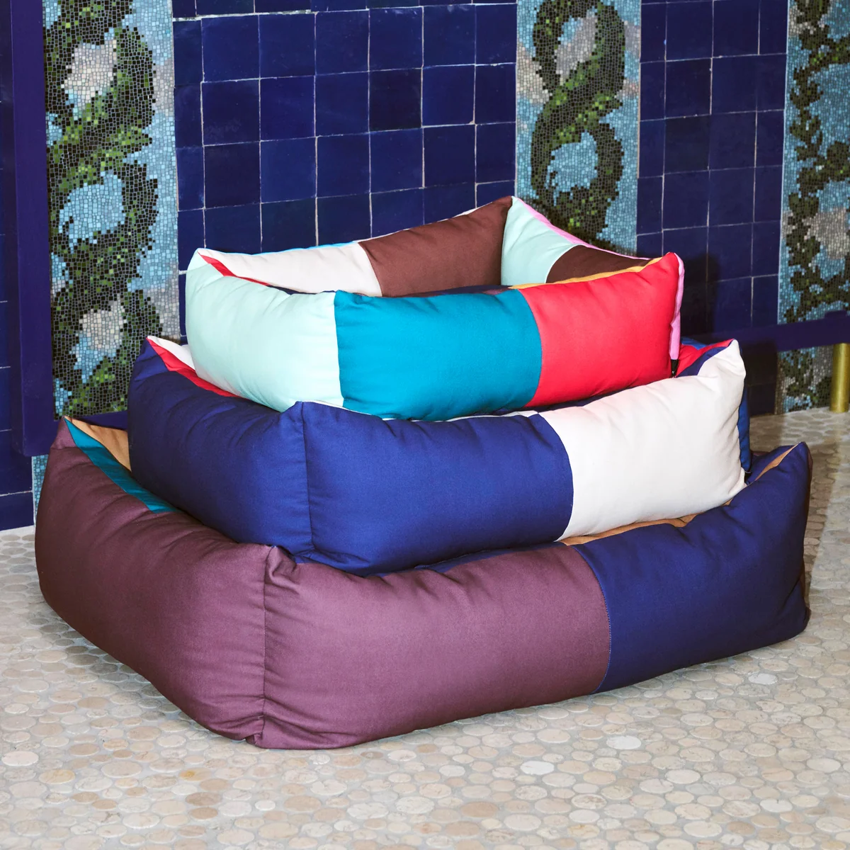 Het hondenbed met zijn speelse kleurblokdesign is gemaakt van robuust, gerecycled polyester en een wasbaar, verwijderbaar kussen gevuld met gerecycled polyester. Het bed is verkrijgbaar in drie verschillende maten in verschillende designs.