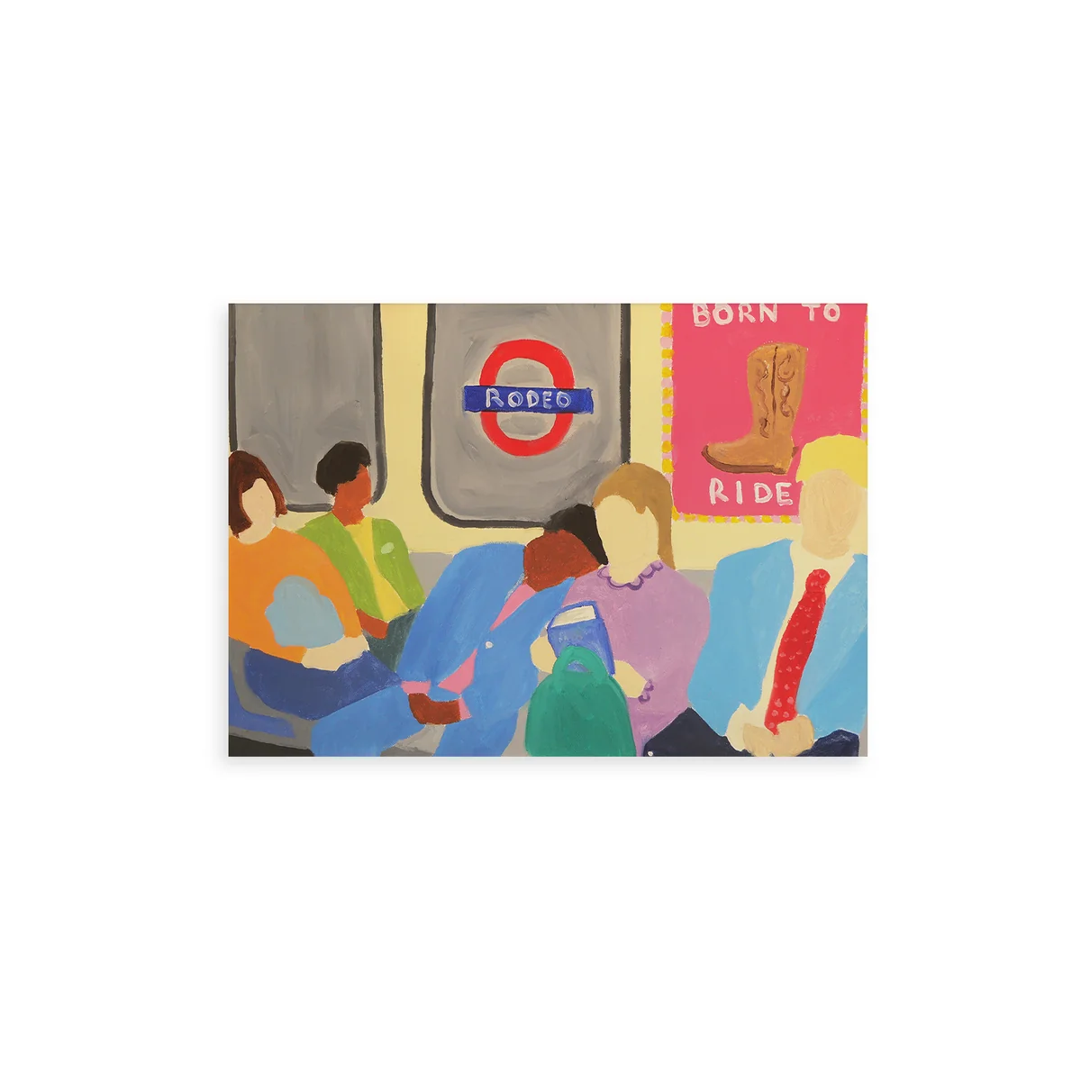 De Born To Ride poster van Paper Collective toont een tegenstrijdig tafereel dat de liefde uitdrukt voor het vertalen van alledaagse momenten door middel van humor en gevatheid. Dit kunstwerk toont een groep mensen in kleurrijke kleding, schijnbaar verdiept in de alledaagse taak van het rijden met de metro naar het werk. Zonder het te weten zijn ze net aangekomen bij het metrostation Rodeo, wat een extra ironisch tintje aan de scène geeft. Een enkel bord draagt bij aan de humor van de scène en moedigt de passagiers aan om los te komen van hun dagelijkse eentonigheid.