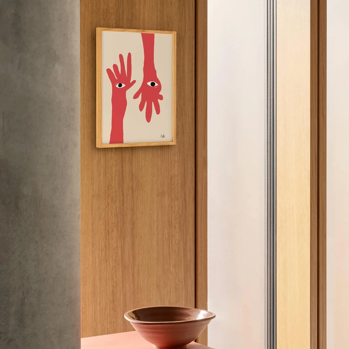 De Hamsa Hands Poster van Paper Collective toneelstukken met het abstracte en het spirituele, met twee rode handen die aan de boven- en onderkant van de foto hangen. In het midden komen twee ogen samen, die met elkaar verbonden zijn om een gezicht te creëren uit twee verschillende werelden.
