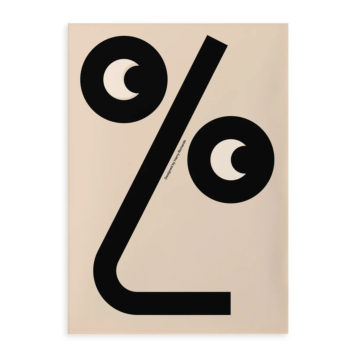 De "%" poster van Harry Richards voor Paper Collective belichaamt de personificatie van eenvoudige typografische elementen op een unieke manier. Geïnspireerd door het minimalistische Zwitserse design uit het midden van de vorige eeuw, is het alledaagse procentsymbool in dit kunstwerk uitgebreid met een neus en twee dwalende ogen. Het resultaat is een gedurfde maar speelse interpretatie die harmonieus past in elk interieur. Met zijn originele ontwerp en vleugje humor is de "%" poster een blikvanger in elke kamer en zal hij liefhebbers van moderne grafische kunst aanspreken.