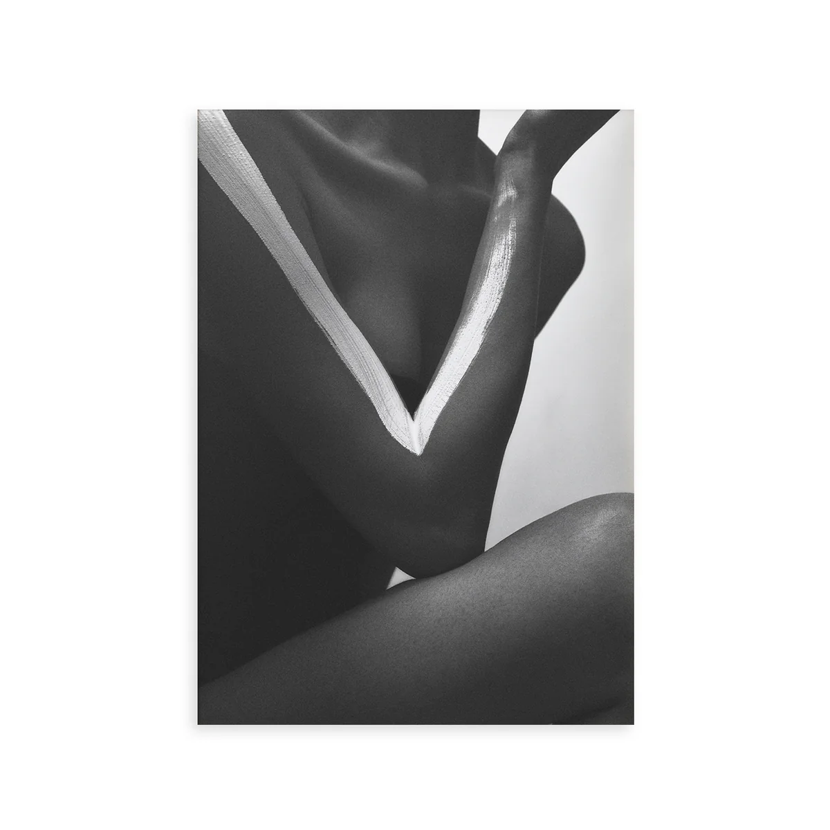 De V-poster van Paper Collective , gemaakt door de Deense fotograaf Henrik Bülow, legt op meesterlijke wijze de nuances en texturen van de menselijke vorm vast. Een enkele geschilderde streek langs de arm van een vrouw loopt uit in een grafische witte V en benadrukt de zachte plooien van het lichaam om een rustgevende maar opvallende compositie te creëren.