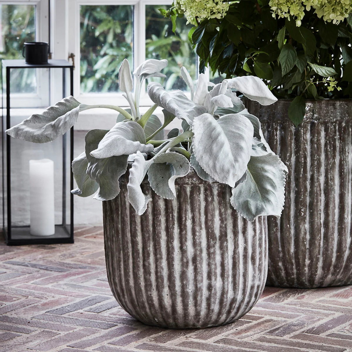 De Pharao plantenpotten van House Doctor geven de tuin een instant update. De handgemaakte steengoed plantenbakken zijn verkrijgbaar in twee maten en hebben een glad glazuur in verschillende bruintinten met witte details en verticale groeven.