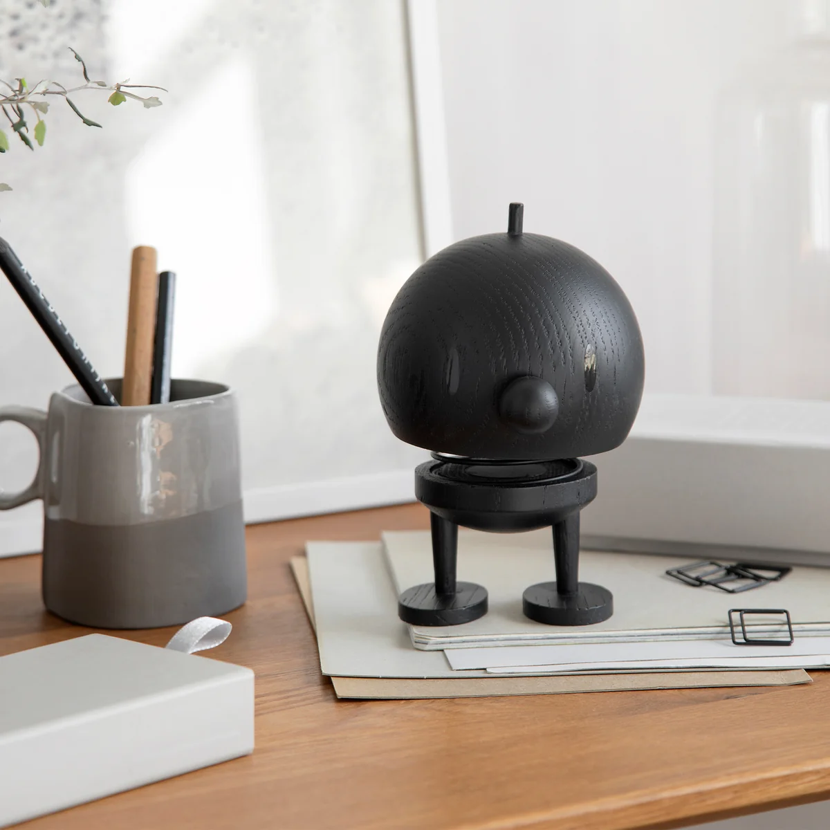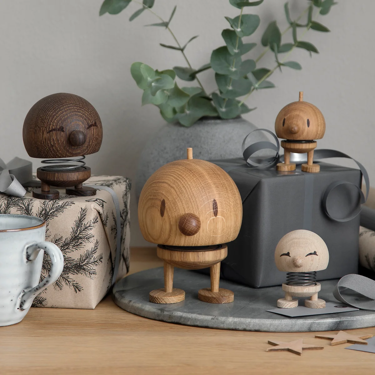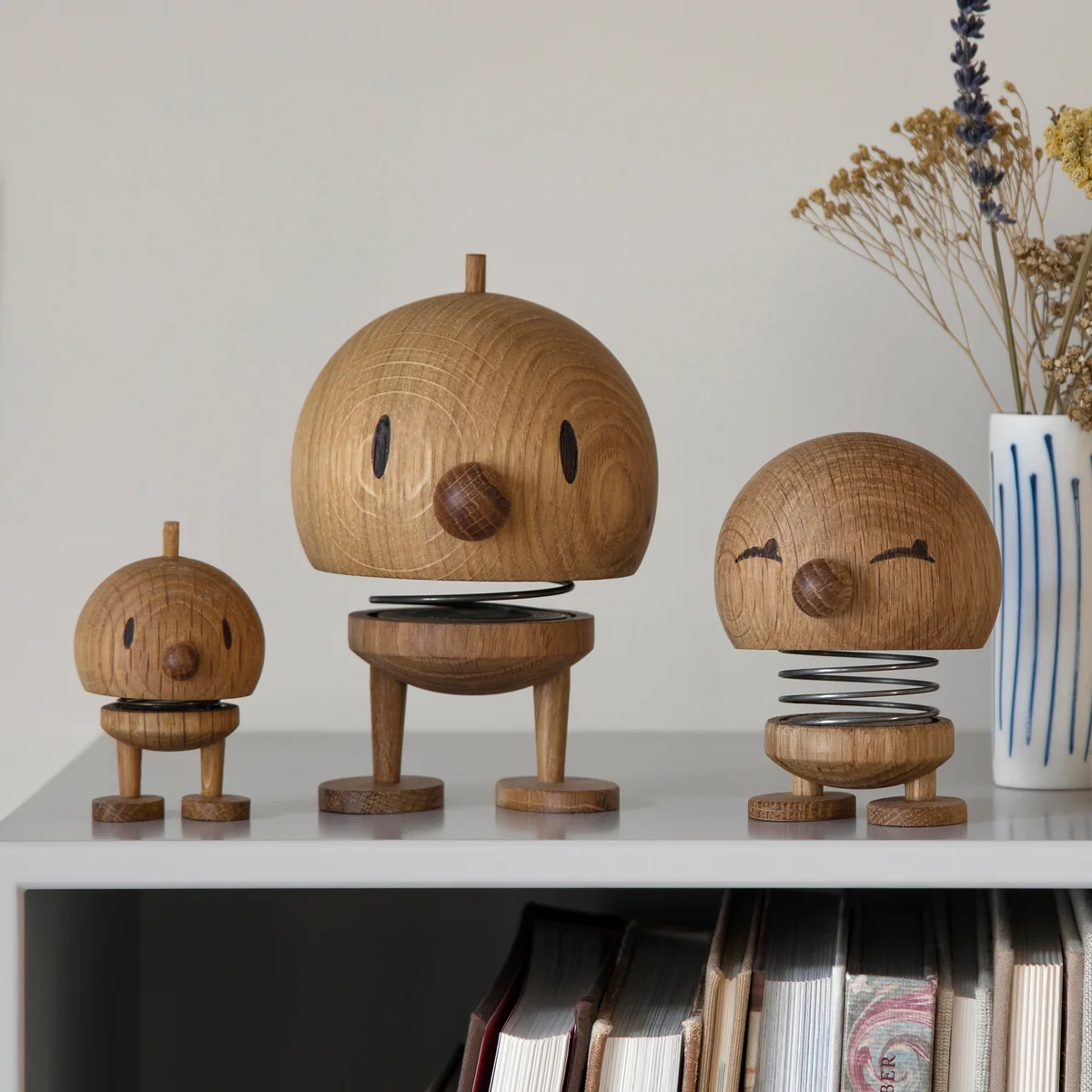 Dit is een stukje echt vakmanschap, een hoogwaardig product dat volledig met de hand in elkaar wordt gezet. Het eikenhout komt uit duurzame Europese bossen. Het natuurlijke materiaal geeft elke afzonderlijke Hoptimist en zijn kenmerkende look. Een bijzonder detail: de ogen zijn ingelegd in wengéhout en geven de figuur zijn levendigheid.
