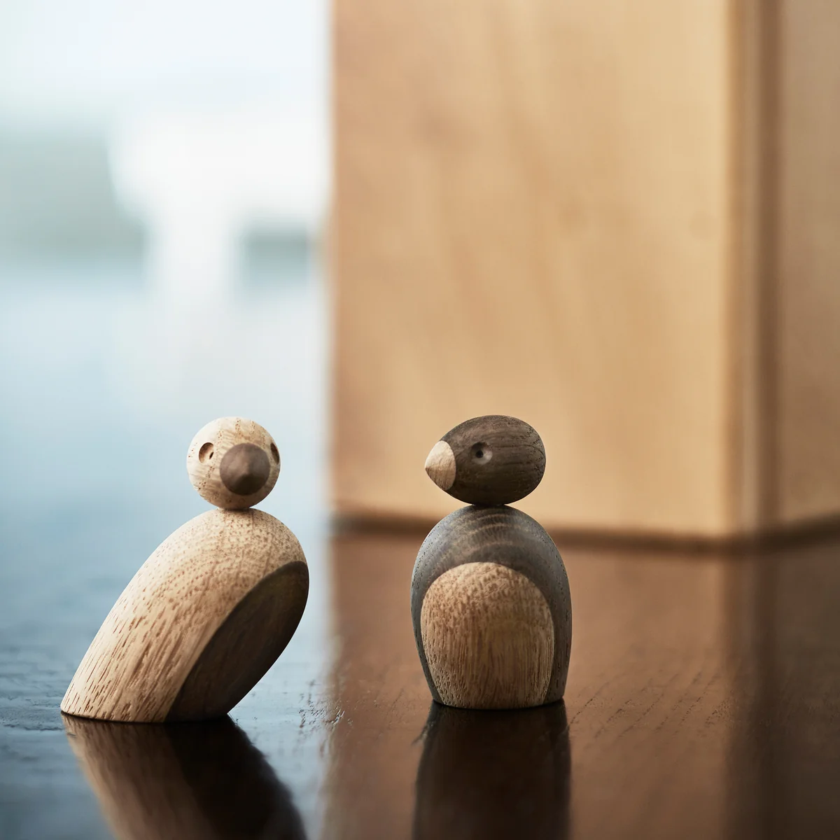Het paar mussen van Kay Bojesen Denemarken zijn twee onafscheidelijke kleine vogels, die zich kenmerken door hun eenvoudige, tijdloze ontwerp. De twee vogels zijn gemaakt van een mix van natuurlijk eikenhout en gerookt eikenhout.