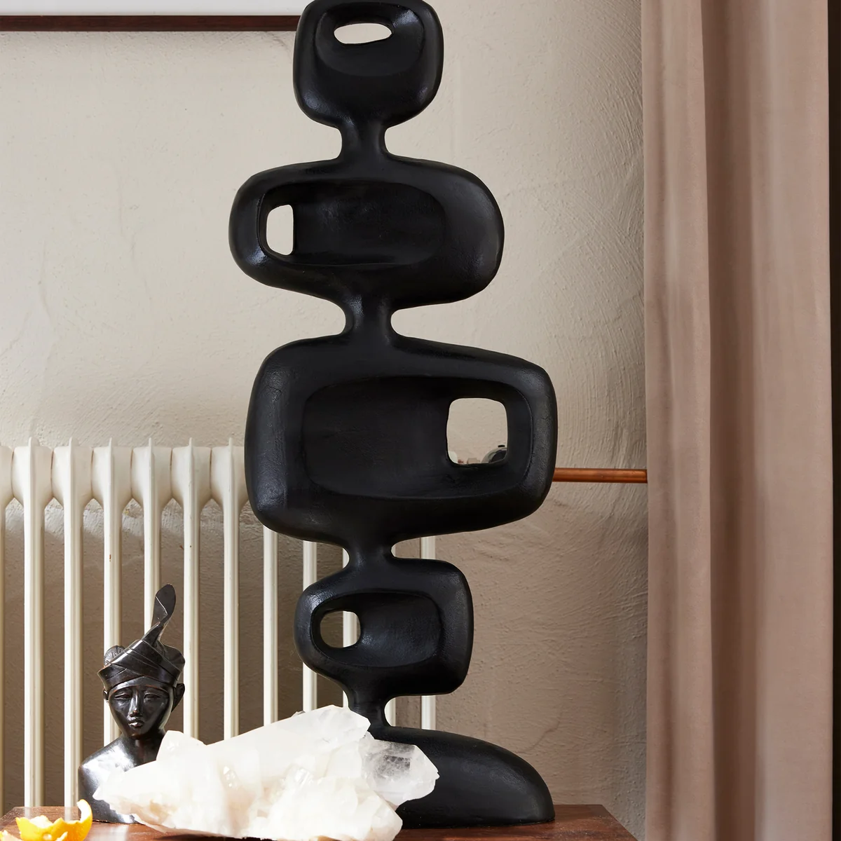 De aluminium sculptuur van het Nederlandse bedrijf HKliving verleent met zijn opvallende uitstraling een karaktervolle blikvanger aan het woonkamerinterieur. De sculptuur is gemaakt van donker aluminium en boeit door zijn speelse vorm. Het kan prachtig worden geplaatst in elke woonruimte - in de woonkamer, slaapkamer of bij de entree.