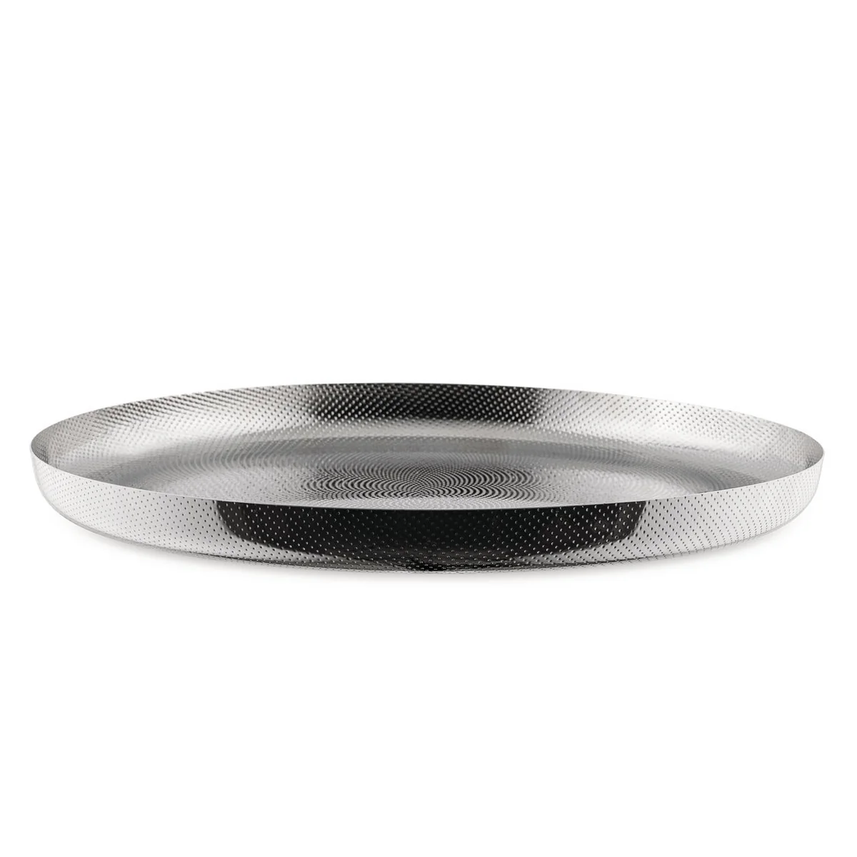Het dienblad met reliëfdecor JM14 van Alessi is perfect voor het serveren van fijne drankjes en desserts. Gemaakt van roestvrij staal, wordt het dienblad gekenmerkt door het esthetische en puristische granulaatdecor. Bij blootstelling aan licht creëert het dienblad een prachtige reflectie die kan worden aangevuld met hoogwaardig glaswerk. Wanneer het dienblad niet wordt gebruikt, siert het elke plaats waar het wordt geplaatst. Multifunctioneel, het dienblad kan worden gebruikt voor service of decoratieve doeleinden.
