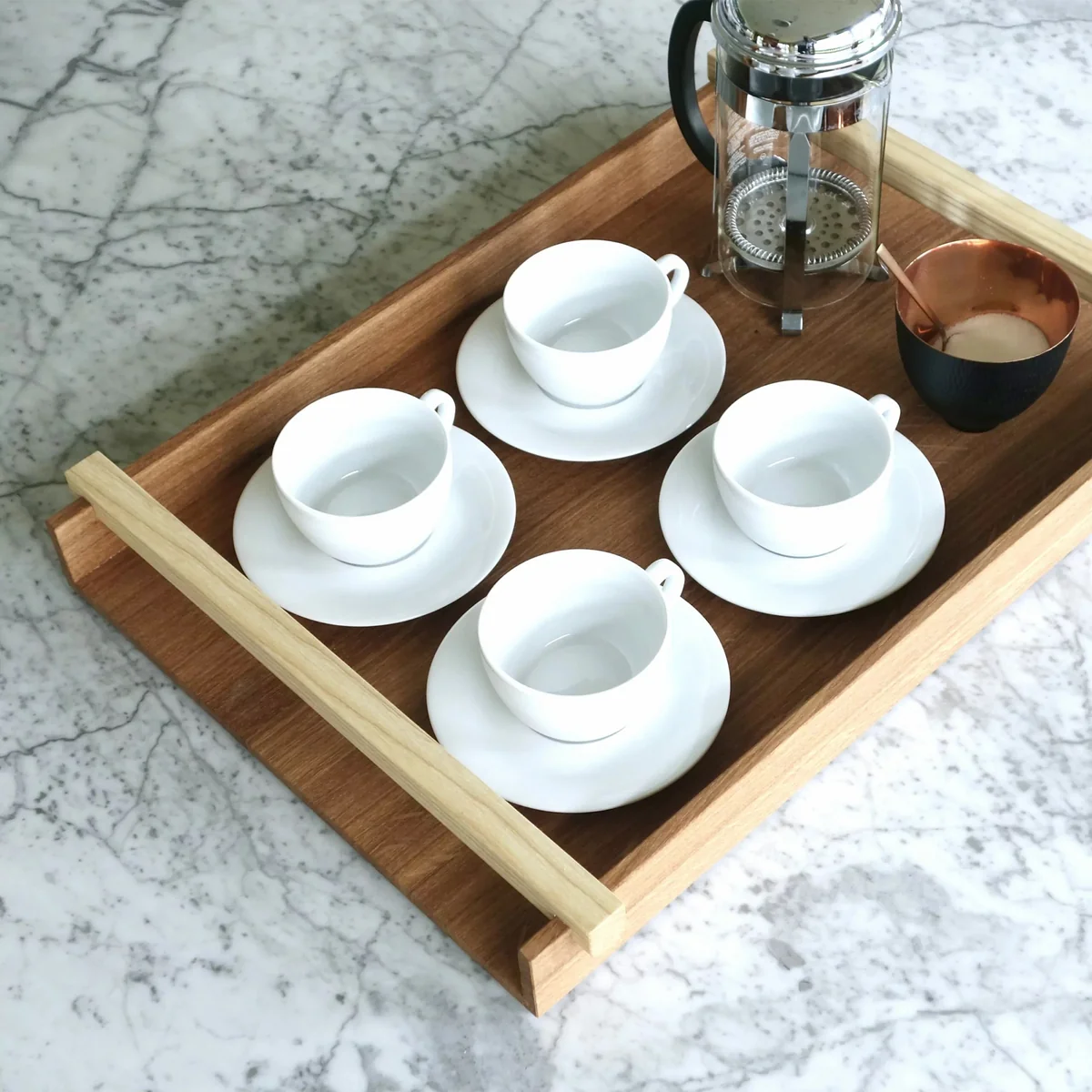 Je zou kunnen denken dat er niets nieuws te verzinnen valt als het gaat om eenvoudige dienbladen. Toch heeft Auerberg zijn eigen dienblad ontwikkeld en het resultaat is een uniek product dat zich richt op de essentie. Het dienblad is ontworpen door Juliane Lanig en Moritz Schmidt, een getrouwd stel. De bewust geaccentueerde handgrepen met hun halfronde profielen zorgen voor een optimale hantering. De karakteristieke afwisseling tussen eiken en essen onderstreept de handgemaakte verbinding van Auerberg . Alle houten onderdelen zijn zorgvuldig behandeld met lijnolie.