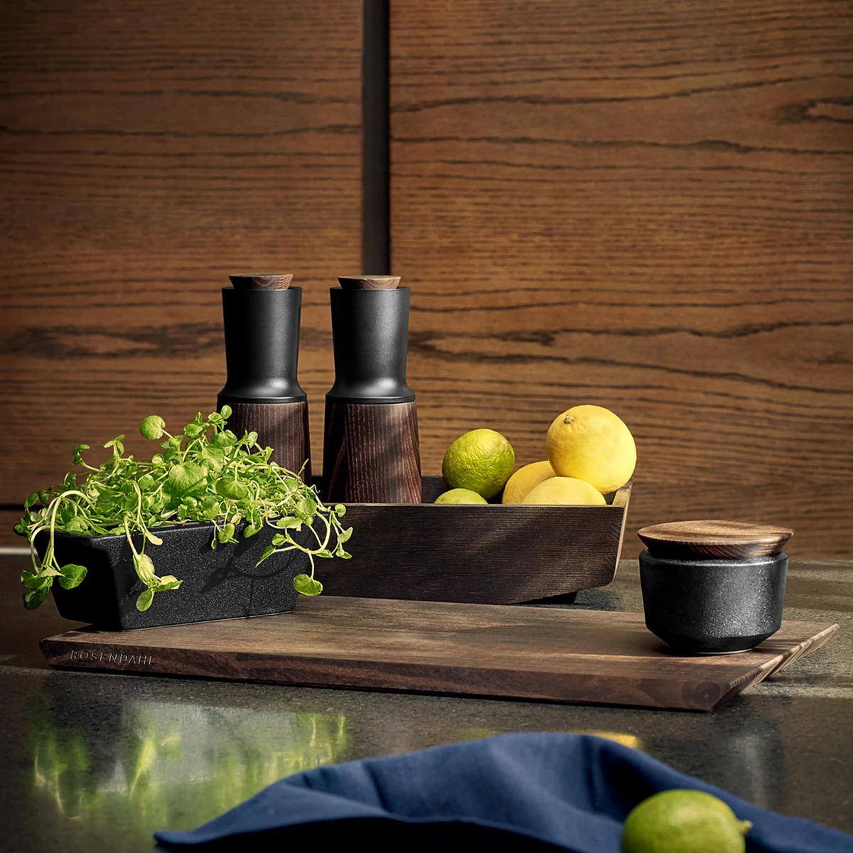 Het kruidenbakje RÅ en het kommetje van Rosendahl zijn voor elkaar gemaakt: Het kleine kruidenbakje van zwart steengoed dient als opbergplaats voor zout, peper en co. en past perfect in het grote bakje van donker essenhout. Omdat de kom in de rand van de schaal is gehaakt, bestaat er geen gevaar dat hij eruit valt.