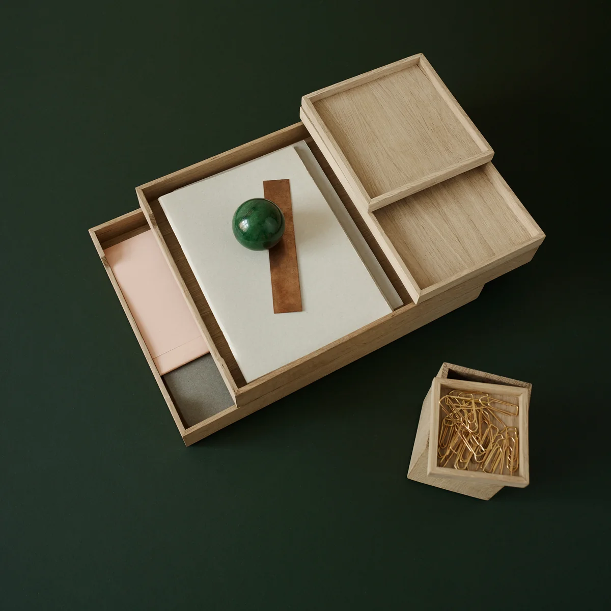 Het ontwerpteam van VE2 heeft voor de Deense fabrikant Skagerak een hoogwaardige bureau-uitrusting van eikenhout ontworpen. De Nomad Trays zijn verkrijgbaar in verschillende maten en kunnen individueel worden gecombineerd en gestapeld - een elegante opbergmogelijkheid voor scharen, pennen, briefopeners en andere kleine voorwerpen.