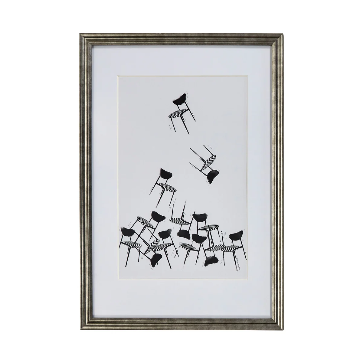 Dit wandkunstwerk geeft elke kamer een speels en modern tintje. House Doctor Het zwart-witte motief met "" stoelen is gevat in een antiek zilver aluminium frame met passe-partout, waardoor diepte en elegantie ontstaan. De veelzijdige ontwerpopties maken het schilderij ideaal voor kleurrijke combinaties of minimalistische wanddecoratie.