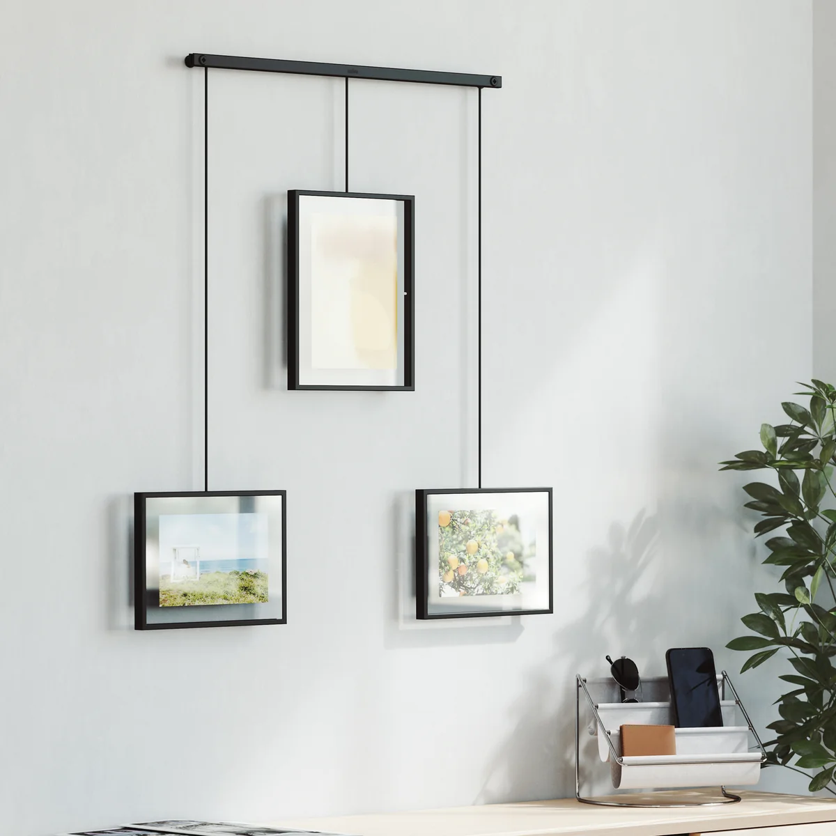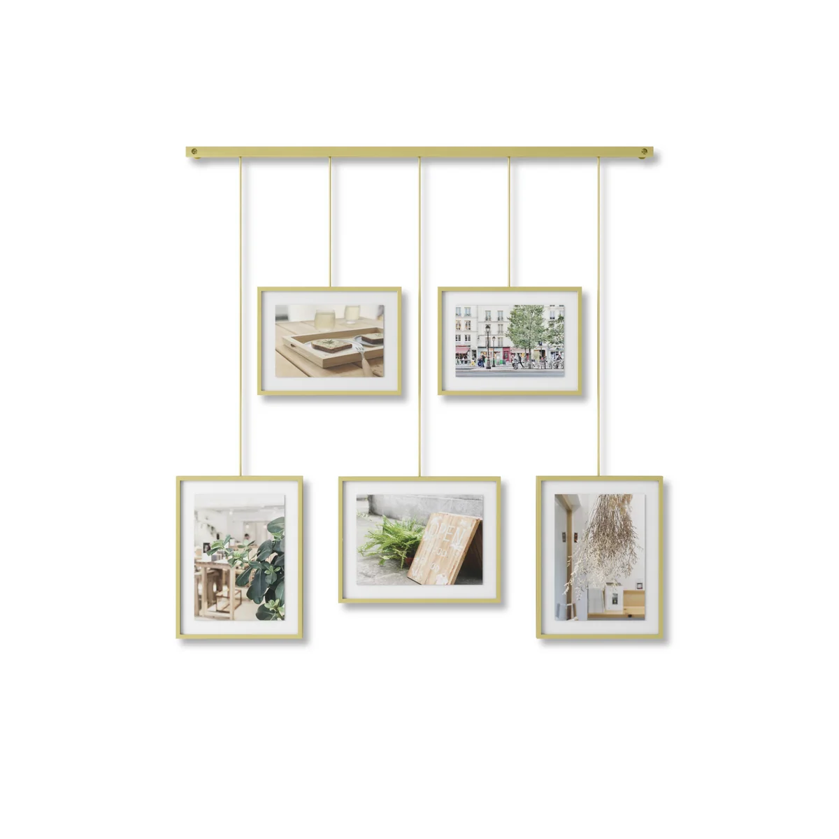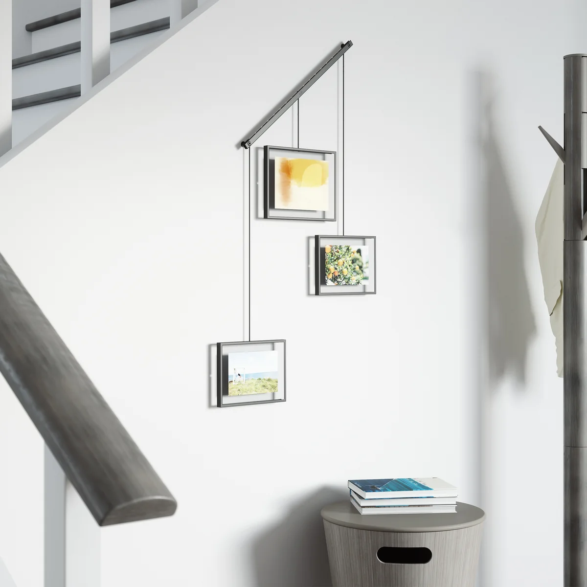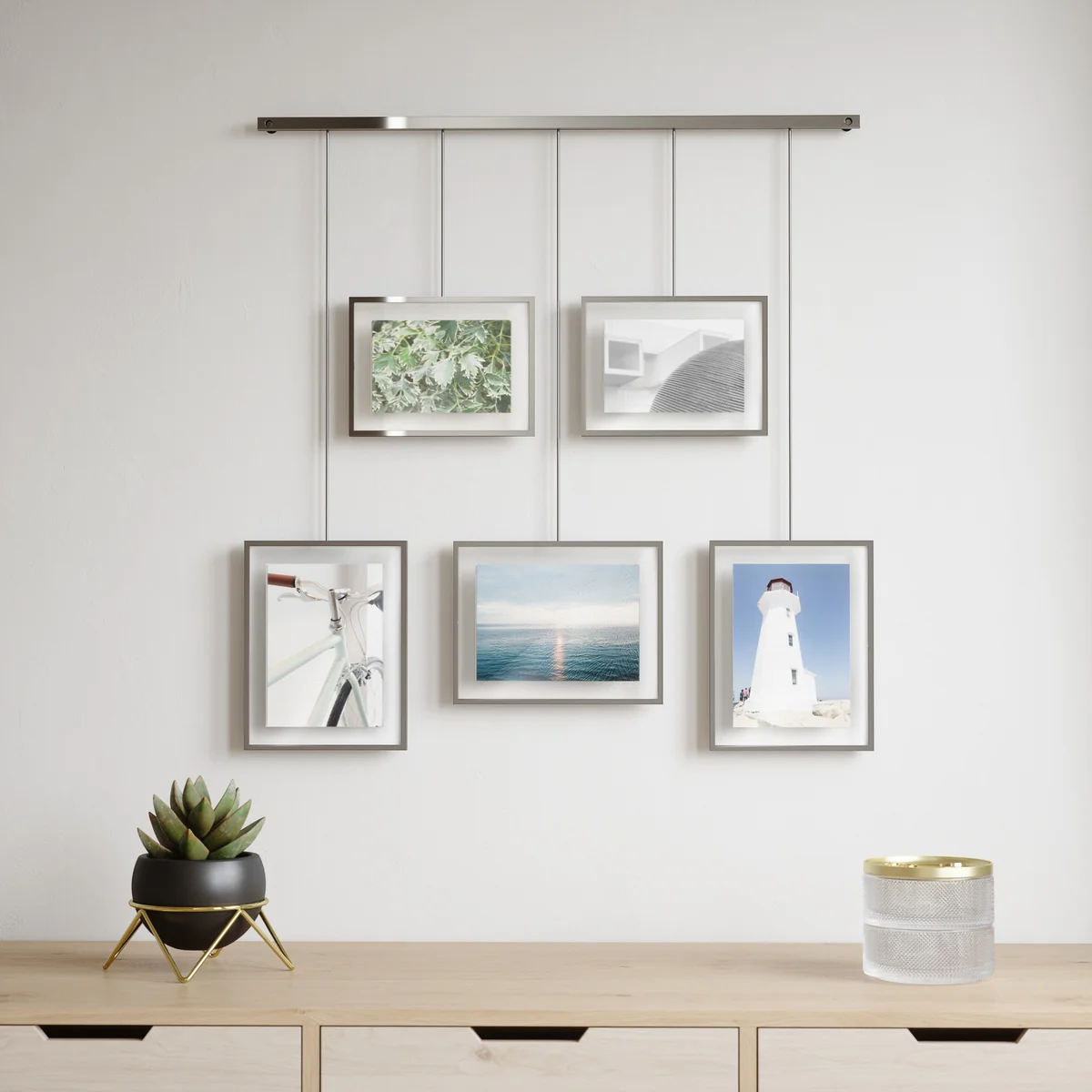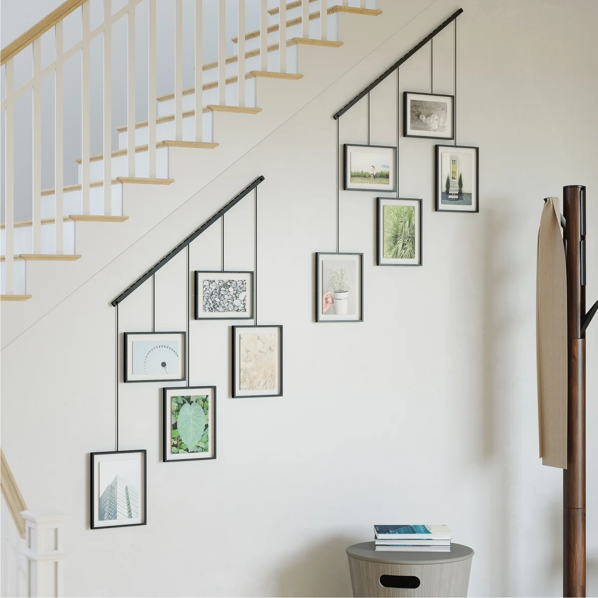 De Exhibit Het fotokader van Umbra past zich aan de meest uiteenlopende lay-outvoorkeuren aan. De kaders kunnen langs de metalen stang worden bewogen en worden gedraaid in de richting van het landschap of het portret. Allerlei favoriete foto's, kunstwerken en illustraties passen in de vijf verschillende formaten fotolijsten. De design fotolijsten dienen ook als mooie en opvallende wanddecoratie voor de woonkamer of de gang.