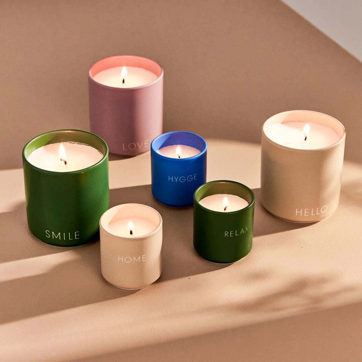 De geurkaars is verkrijgbaar Design Letters geurkaars is verkrijgbaar in verschillende versies: HOME maakt indruk met natuurlijke aroma's en een vleugje verse bloemen en citrusvruchten. SMILE ruikt naar lentebloemen, hout en bevat tonen van fruit. BATH heeft een kalmerende werking en de frisse, bloemige geur van lelietjes-van-dalen en gras.