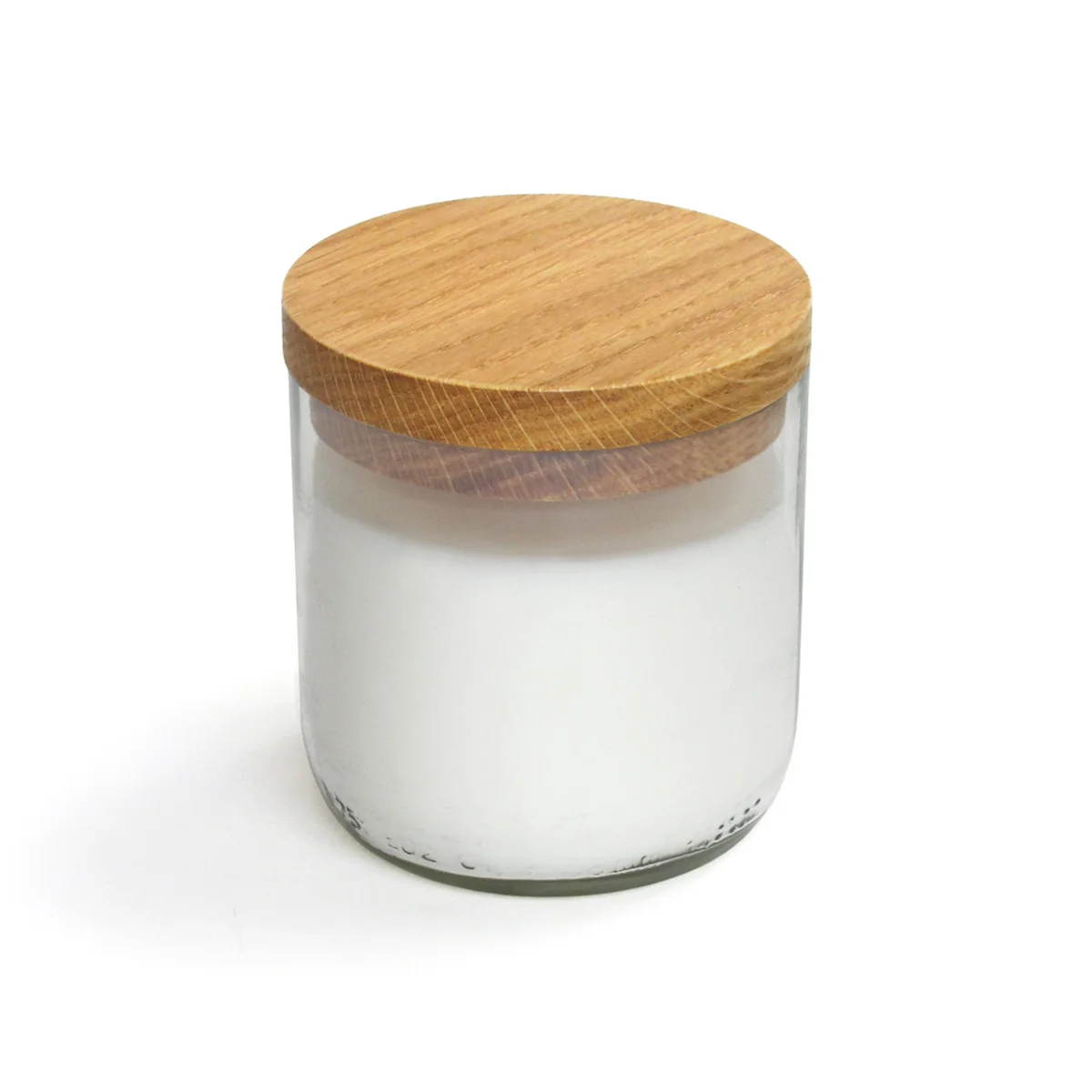 De kaars in een glas van side by side combineert eenvoudig ontwerp, duurzaamheid en vakmanschap op een stijlvolle manier. Gemaakt van gerecyclede flessen en voorzien van een geolied eikenhouten deksel, is elke lantaarn een uniek stuk. De pot is gevuld met natuurlijke koolzaadwas, die geurloos brandt - ideaal voor iedereen die geurstoffen wil vermijden.