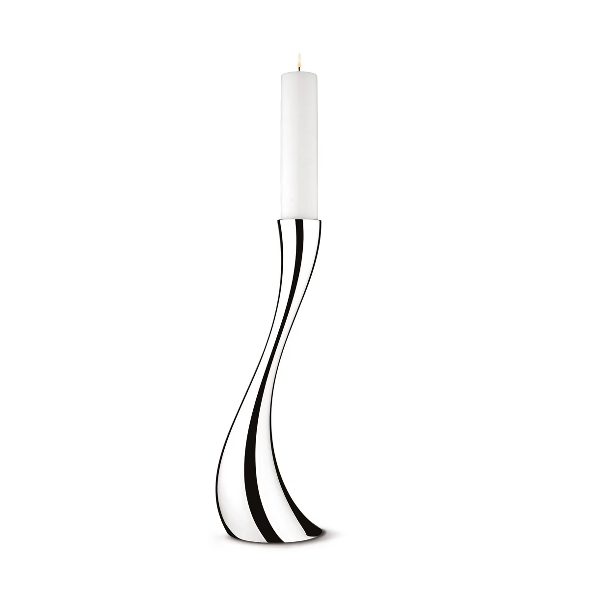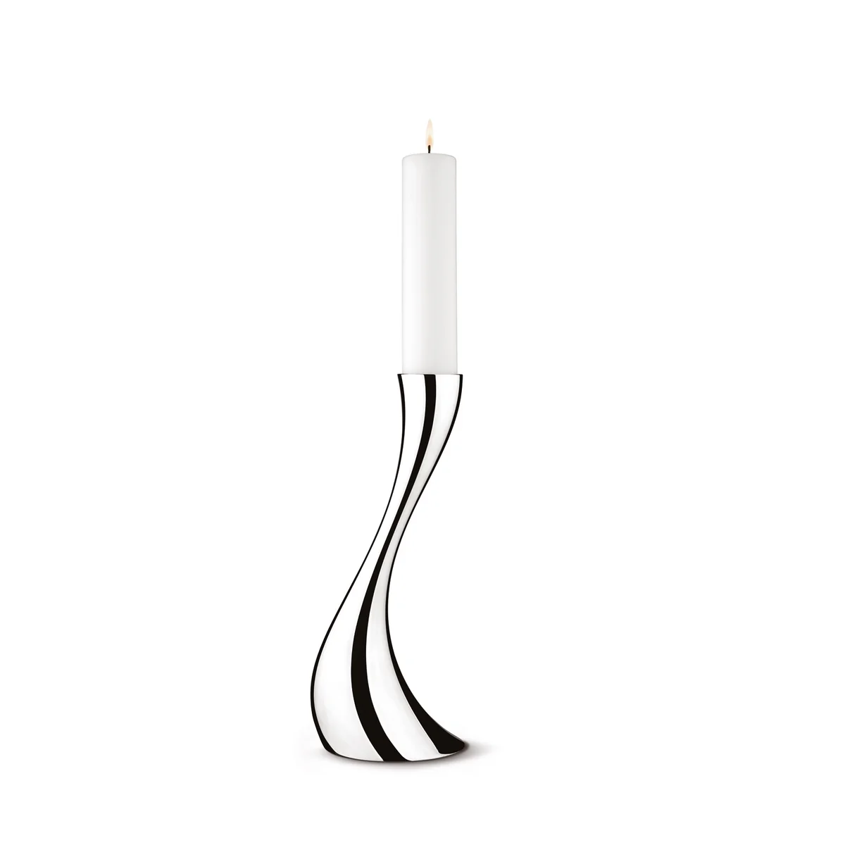 De Duitse ontwerper Constantin Wortmann speelt graag met de perceptie van de kijker. Zijn kandelaar voor Georg Jensen is een typisch voorbeeld van zijn visie op transformatie: 'Ik stelde me gewoon het bekende silhouet van een standaard kandelaar met organische rondingen voor. Het resultaat is een kandelaar die er uitziet als een beetje gesmolten, maar tegelijkertijd een soepele vitaliteit uitstraalt die ook functioneel perfect is. Het dankt zijn naam, Cobra, aan zijn slangachtige ontwerp en kracht.