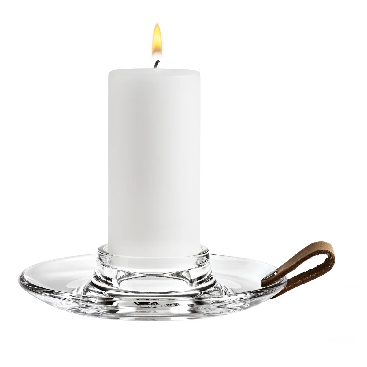 De glazen blokkandelaar met karakteristieke leren lus maakt deel uit van de populaire serie "Design with Light" van Holmegaard . Ontwerpster Maria Berntsen creëerde voor de serie speciale glazen objecten die een gezellige sfeer creëren met kaarsen.