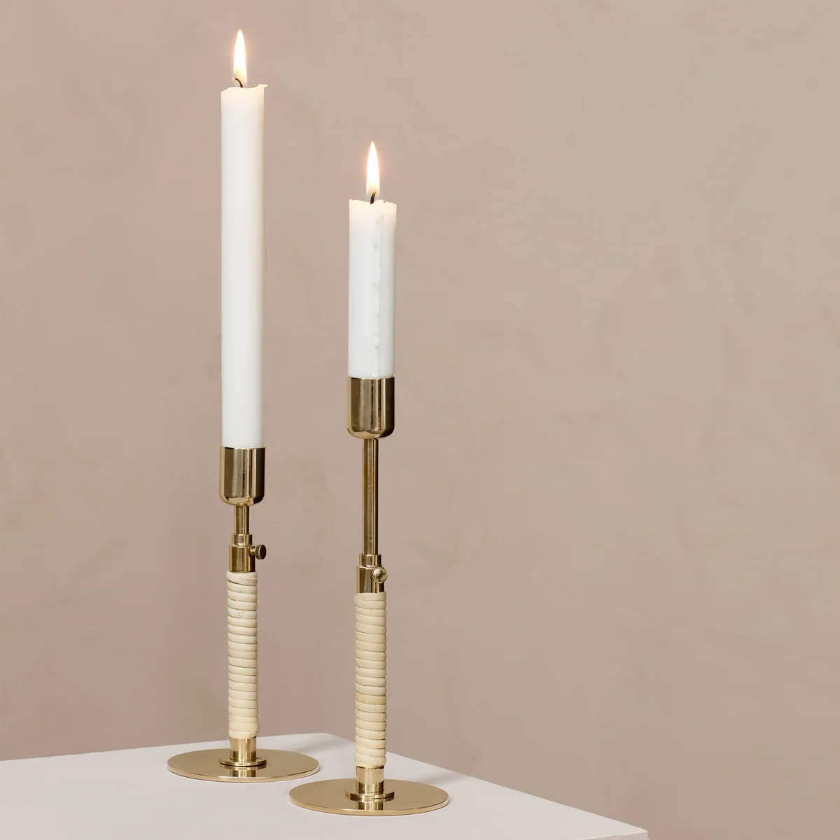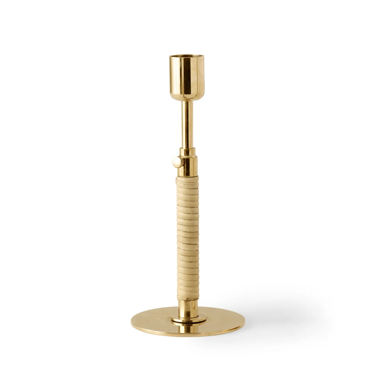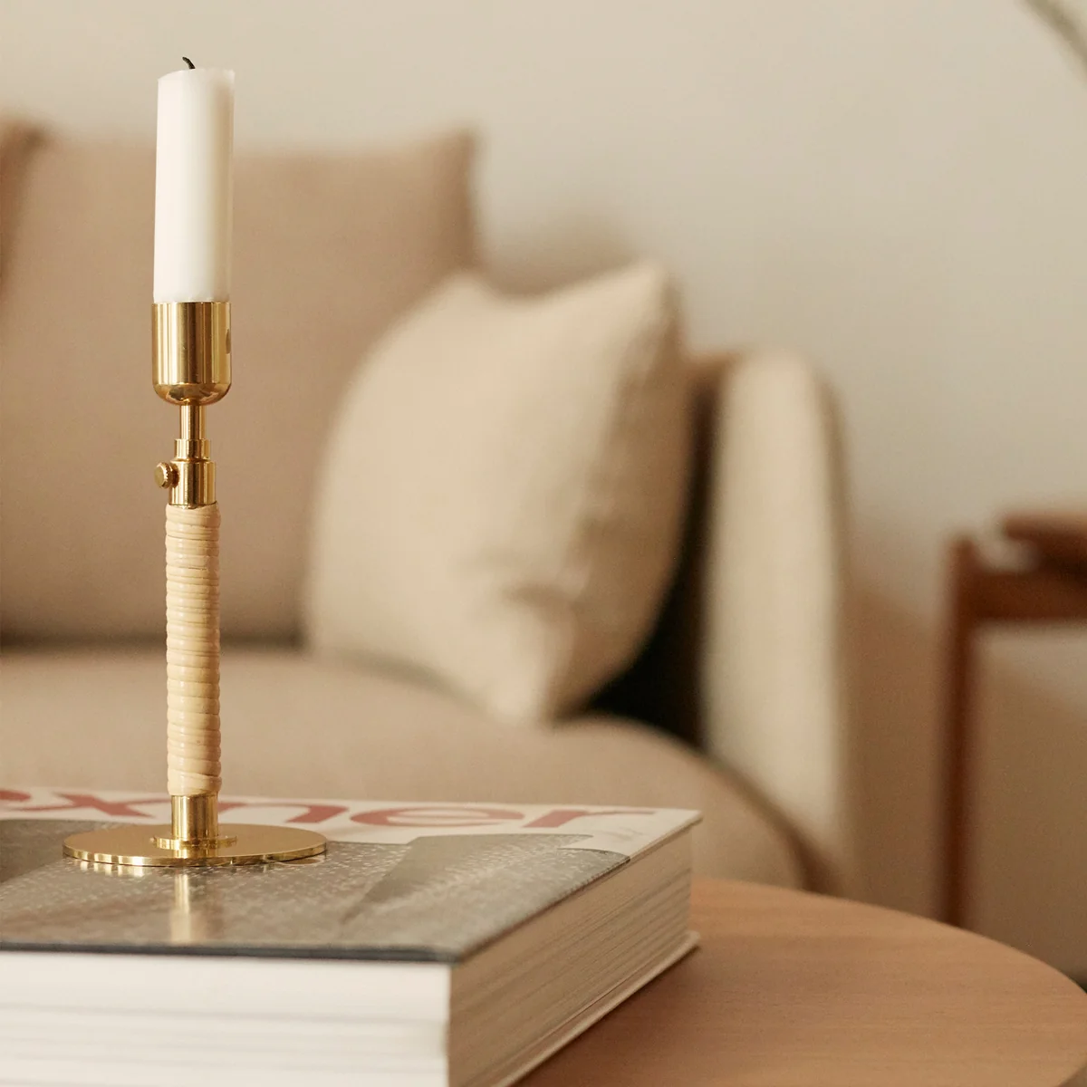 De Duca kandelaar van de Deense ontwerpstudio Krøyer-Sætter-Lassen voor Audo wordt gekenmerkt door de combinatie van verschillende materialen en zijn bijzondere functie: Door de schroef op de slanke schacht los te draaien, kan de hoogte van de kandelaar worden aangepast terwijl de kaars brandt. Gemaakt van gepolijst of gepolijst messing en gedetailleerd met rotan om de onderste helft, voegt het eenvoudige maar effectieve ontwerp intimiteit en warmte toe aan zijn omgeving.