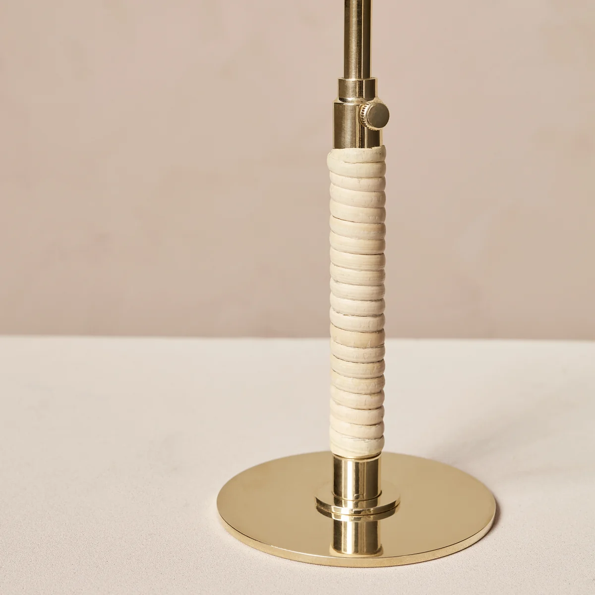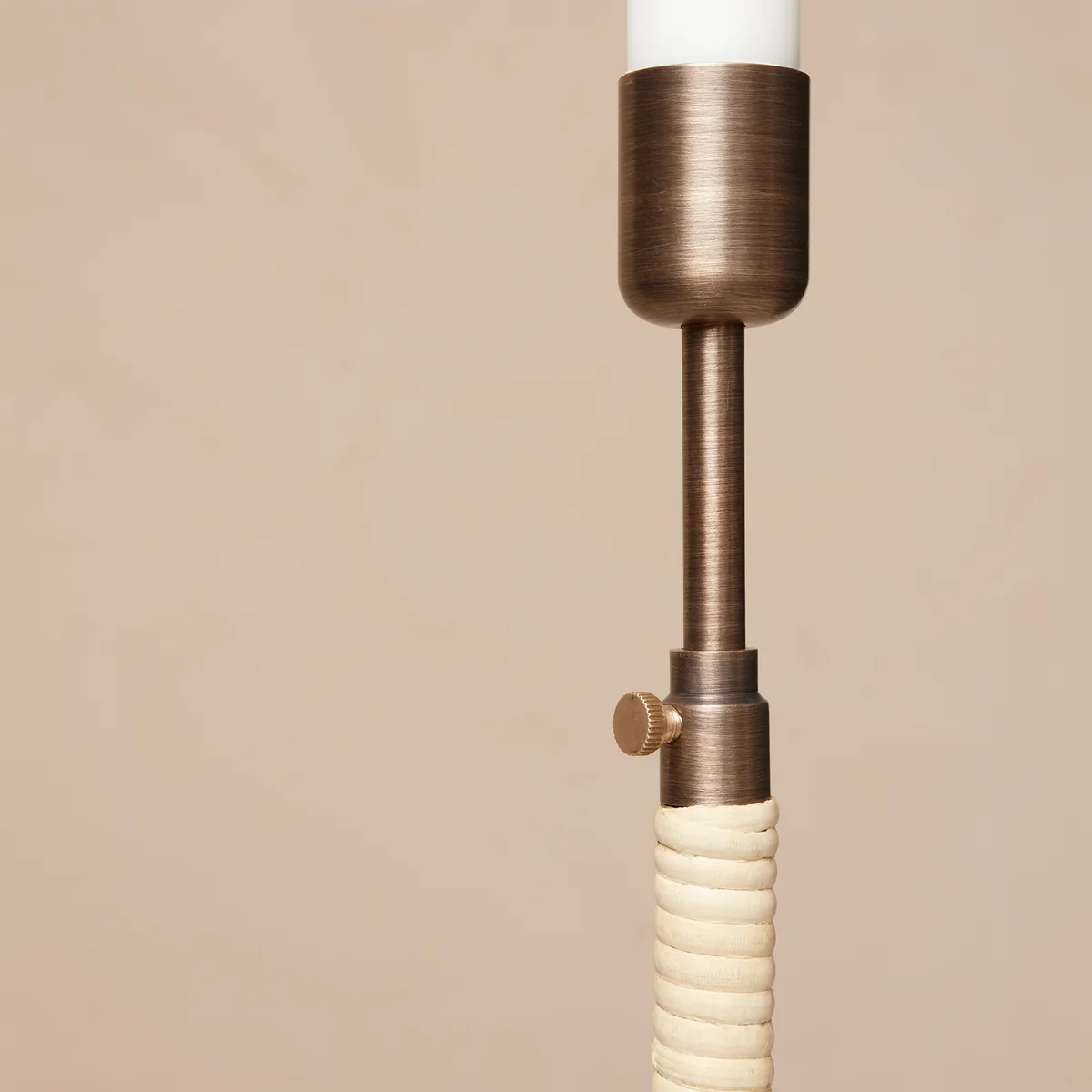 De schroef daagt het typisch statische silhouet van het object uit en stelt de gebruiker in staat de hoogte van de kandelaar aan te passen door hem te verlengen of in te korten. Verkrijgbaar in gepolijst messing of bronskleurig messing gecombineerd met rotan, combineert Duca natuurlijke materialen om een gezellige sfeer te creëren.