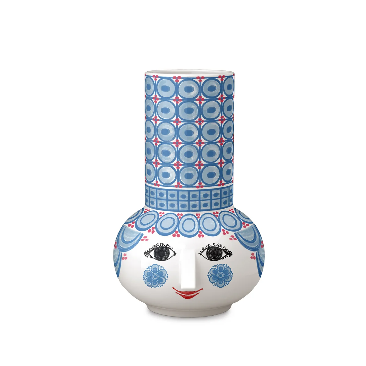 De Olga kandelaar van Bjørn Wiinblad harmonieert artistieke speelsheid en Scandinavische keramiek. De karakteristieke figuur met een fijn bewerkt gezicht en bloemenpatroon draagt een klassieke kaarsentuit op zijn hoofd - een typisch stijlelement uit Wiinblad's fantasierijke beeldtaal. Het glanzende glazuur geeft de kandelaar een levendig oppervlak, terwijl het opvallende silhouet het een decoratief hoogtepunt maakt op tafel, in de vensterbank of op het dressoir.