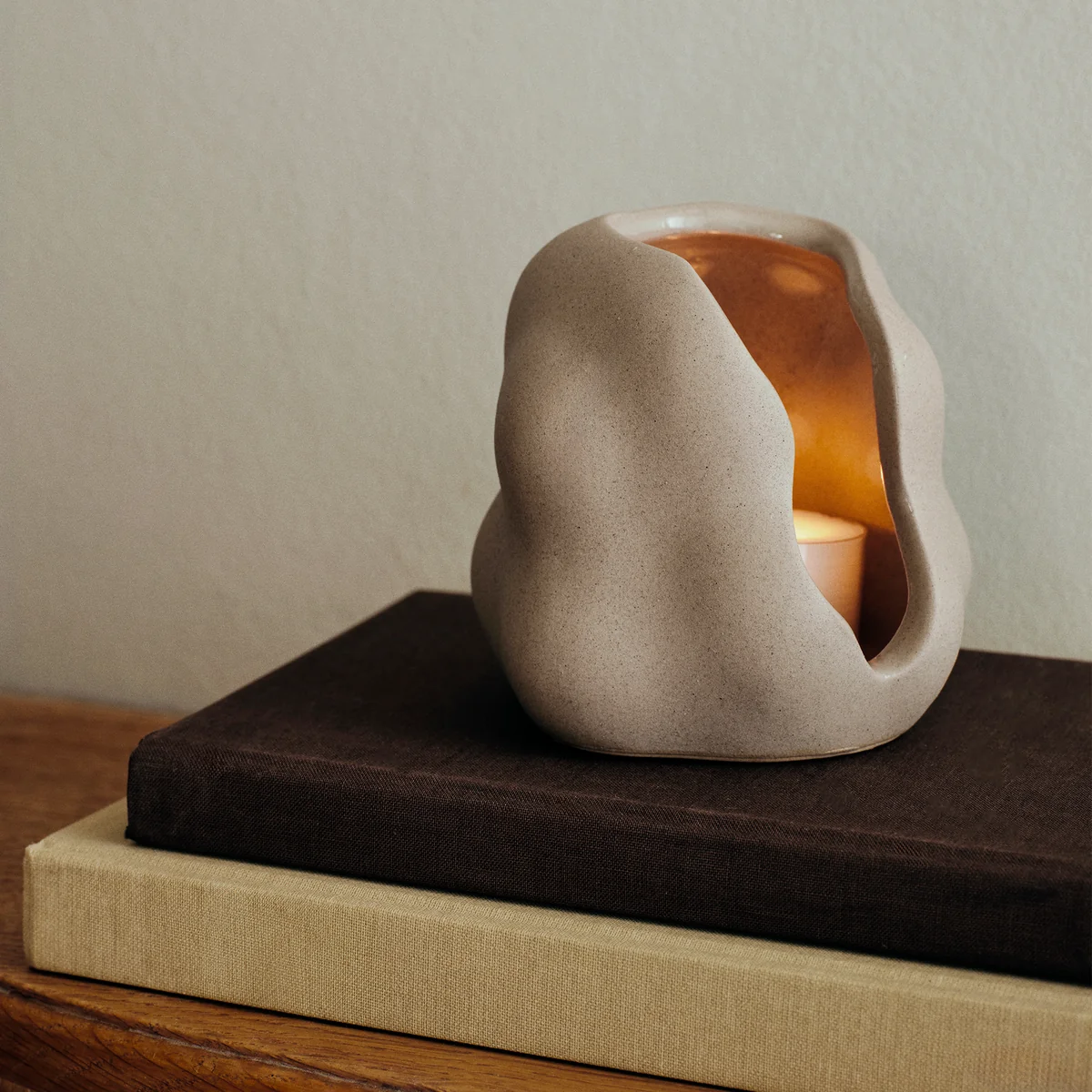 Het ruwe oppervlak geeft een organische charme, terwijl de geglazuurde binnenkant de magie van het kaarslicht nog meer benadrukt. De unieke vorm doet denken aan een kleine grot, die de pilaarkaars zachtjes omsluit en warmte en sereniteit brengt in elke kamer. Dankzij het sfeervolle licht straalt de Hekla kandelaar rust uit en verandert de omgeving in een stijlvolle, gezellige oase.