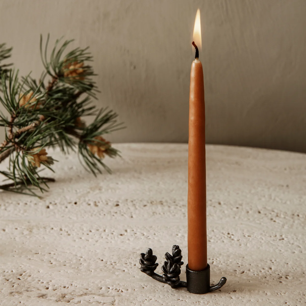 De twig kandelaar van Ferm Living is geïnspireerd op een klein takje in de natuur. De miniatuurkandelaar rust nonchalant, maar ook zeer elegant op het tafelblad. Met een prachtig gedetailleerd oppervlak is de twijgkandelaar gemaakt van 100% massief messing. Hij vormt een tak met drie mooie dennenappels.