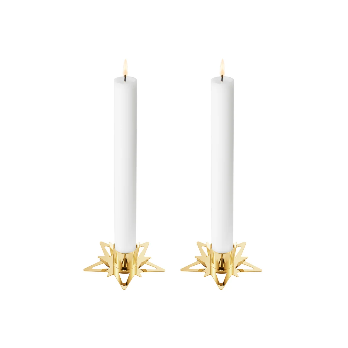 De Classic Christmas kaarsenhouders ster van Georg Jensen zijn geschikt voor stompkaarsen of stompkaarsen en zorgen voor een sfeervolle ambiance. Wanneer de kaars wordt aangestoken, fonkelt het gouden motief in het kaarslicht en is het bijzonder doeltreffend. De basis van de houders heeft de vorm van een ster, waardoor ze de ideale accessoires zijn voor de kerstperiode.