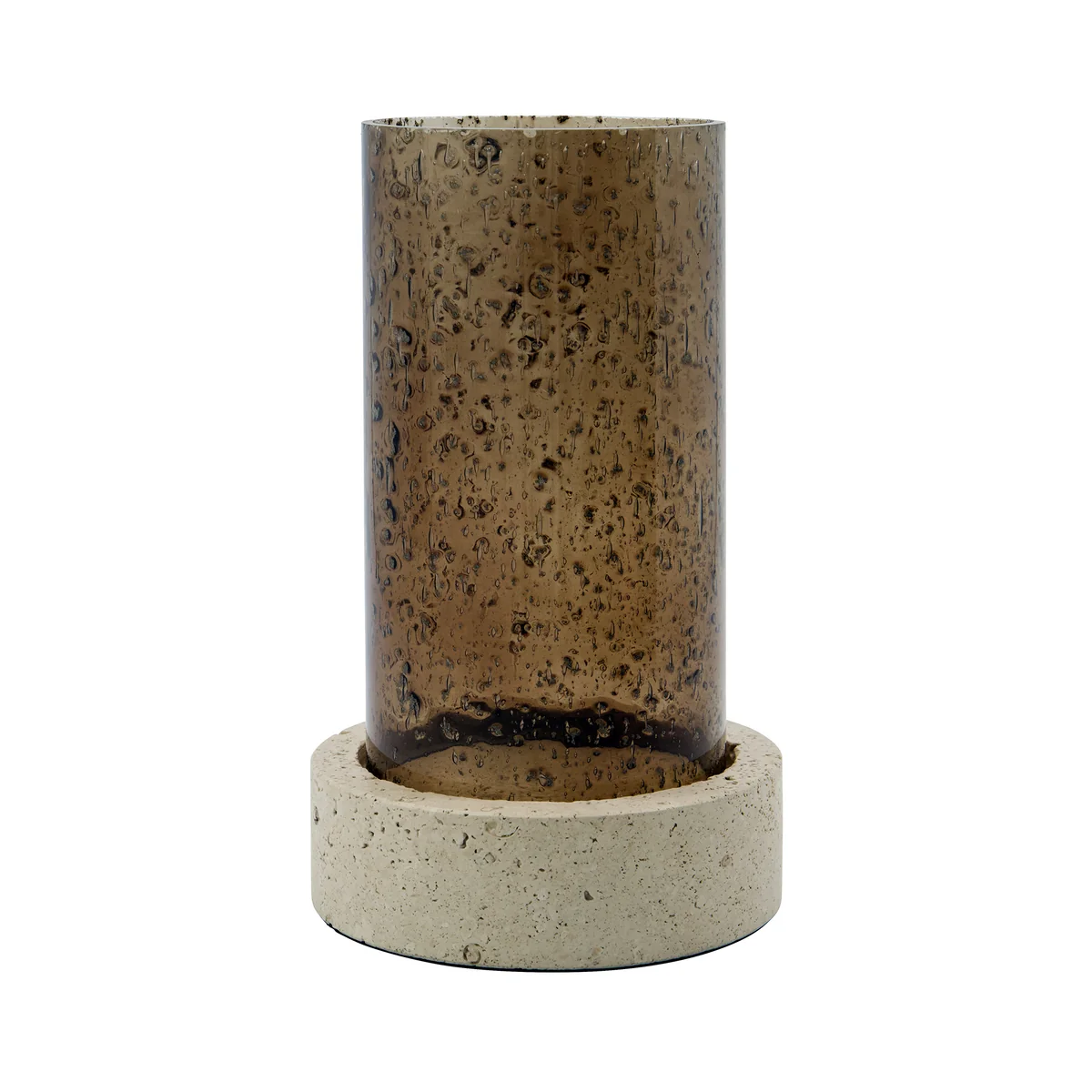 House Doctor De Rivo kandelaar van combineert modern design met natuurlijke elegantie. De slanke, glazen standaard toont de kaars stijlvol, terwijl de travertijnen voet een robuuste, aardse touch aan het geheel toevoegt. Deze combinatie van transparant glas en de warme, getextureerde steen creëert een harmonieuze balans tussen lichtheid en stabiliteit. De Rivo kandelaar is niet alleen een functioneel object, maar ook een kunstwerk dat elke ruimte een verfijnde en tijdloze sfeer geeft.