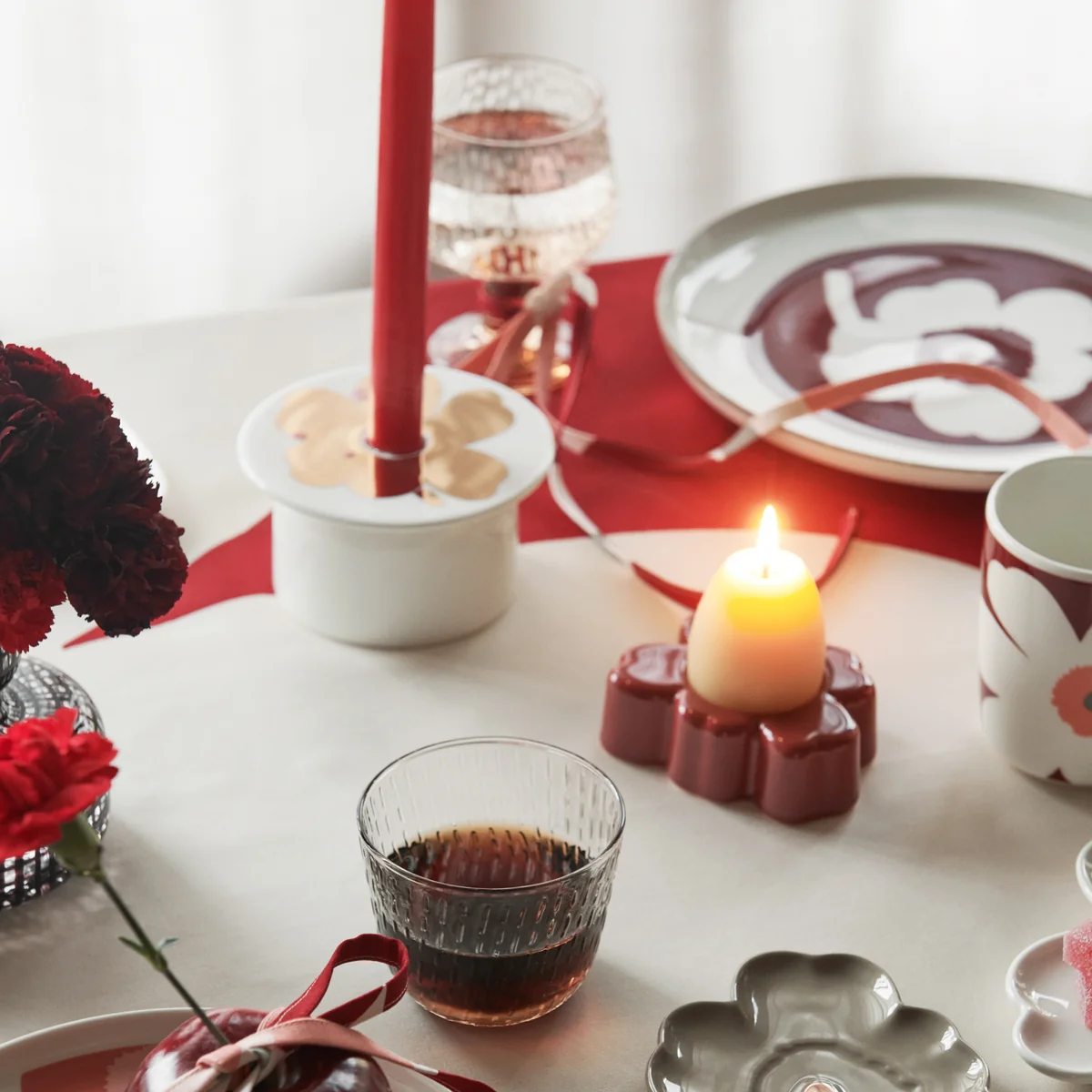 Marimekko De Oiva Unikko kandelaar van is gemaakt van wit steengoed. Op het schoteltje staat de Unikko bloem afgebeeld, die is versierd met gouden metaalpigmenten. Vanwege de delicate gouden details wordt aanbevolen om dit product met de hand af te wassen.