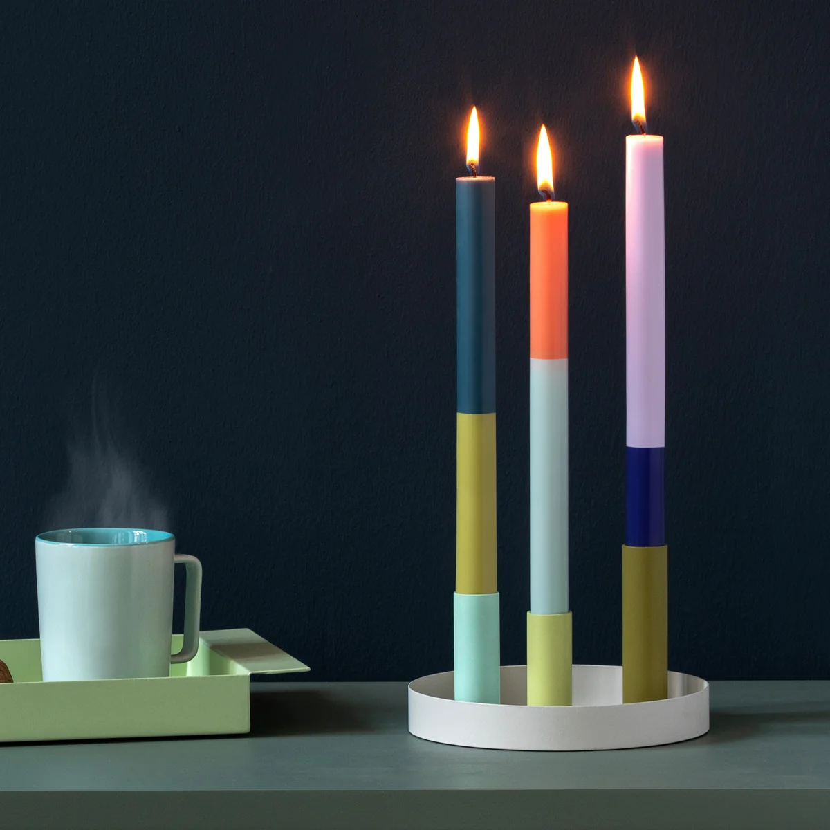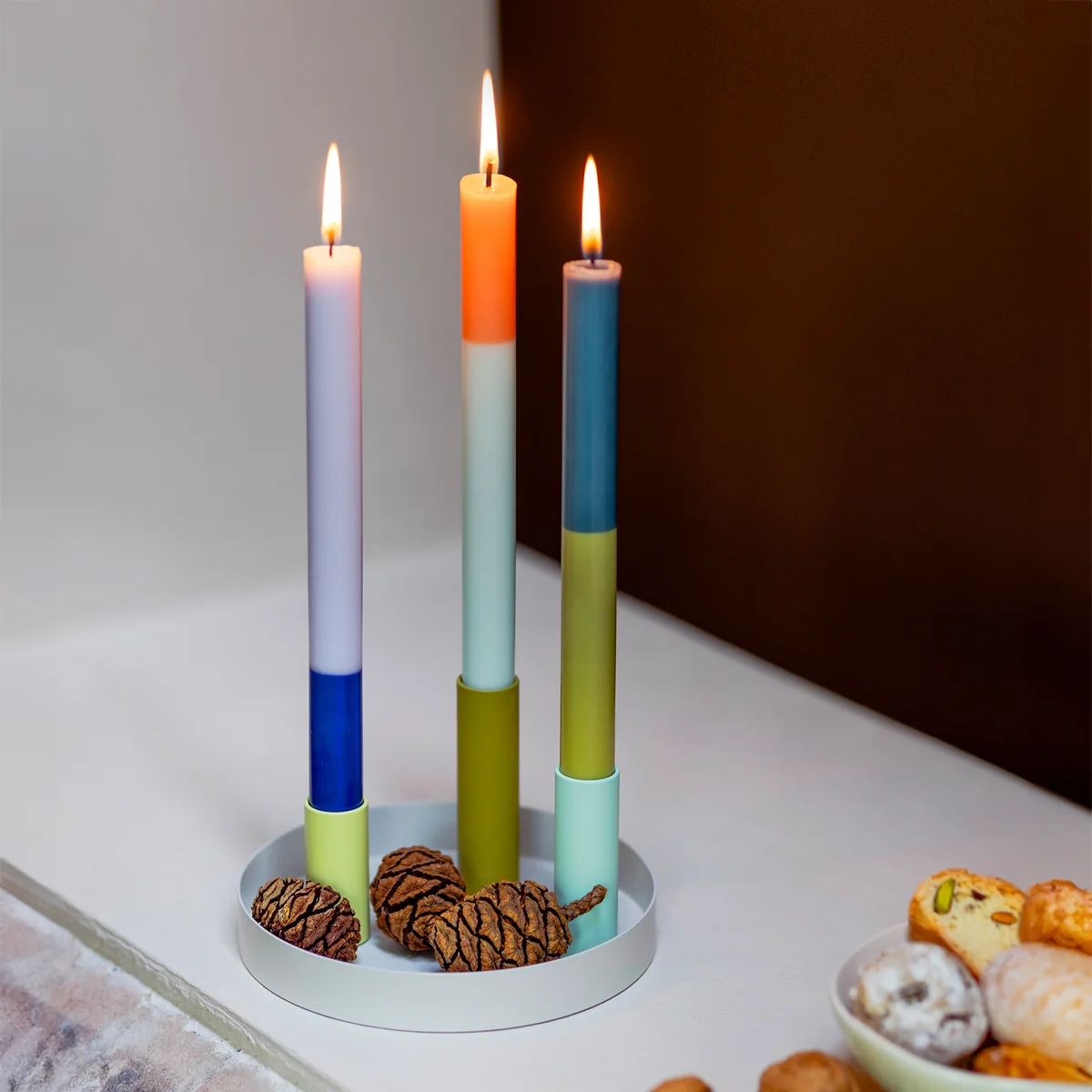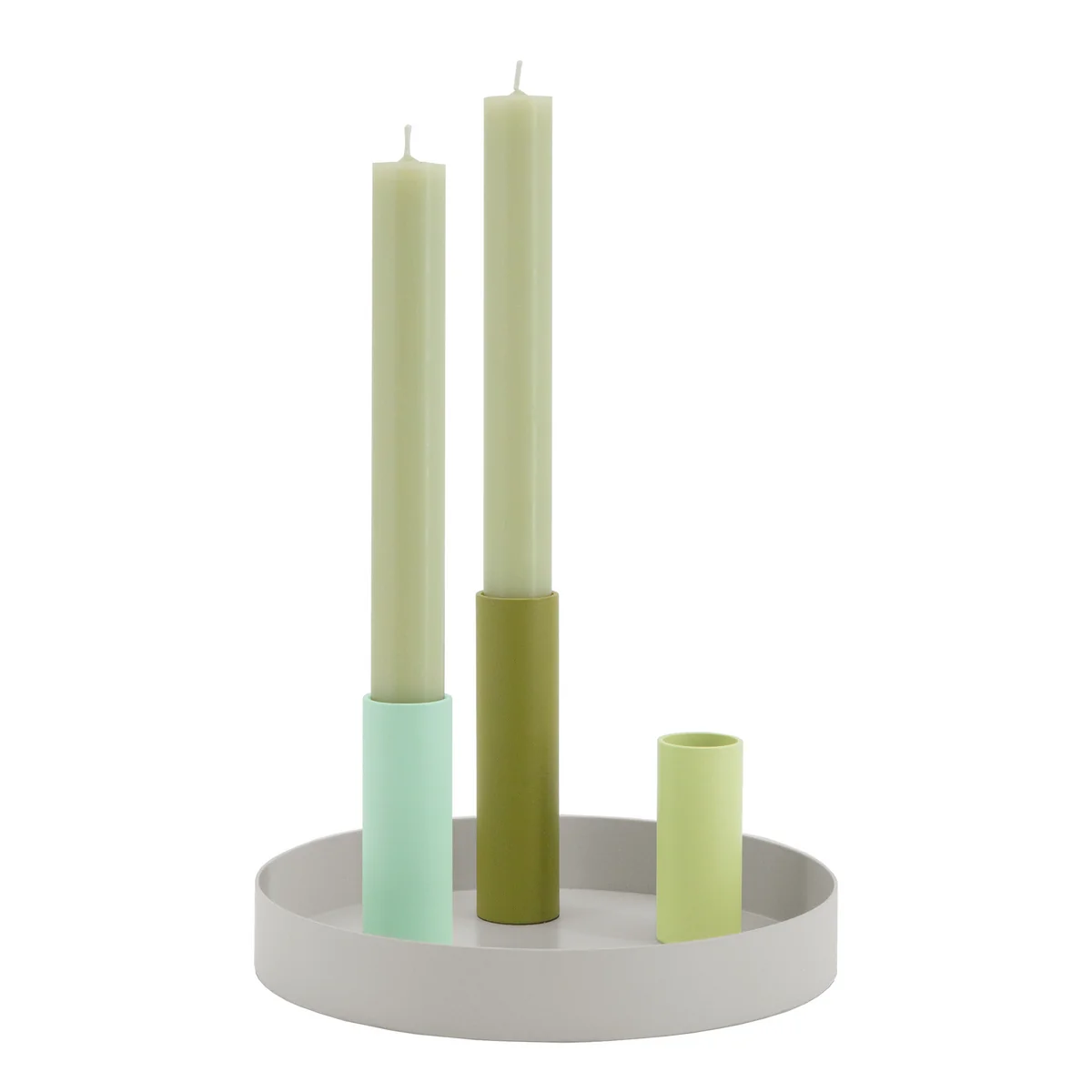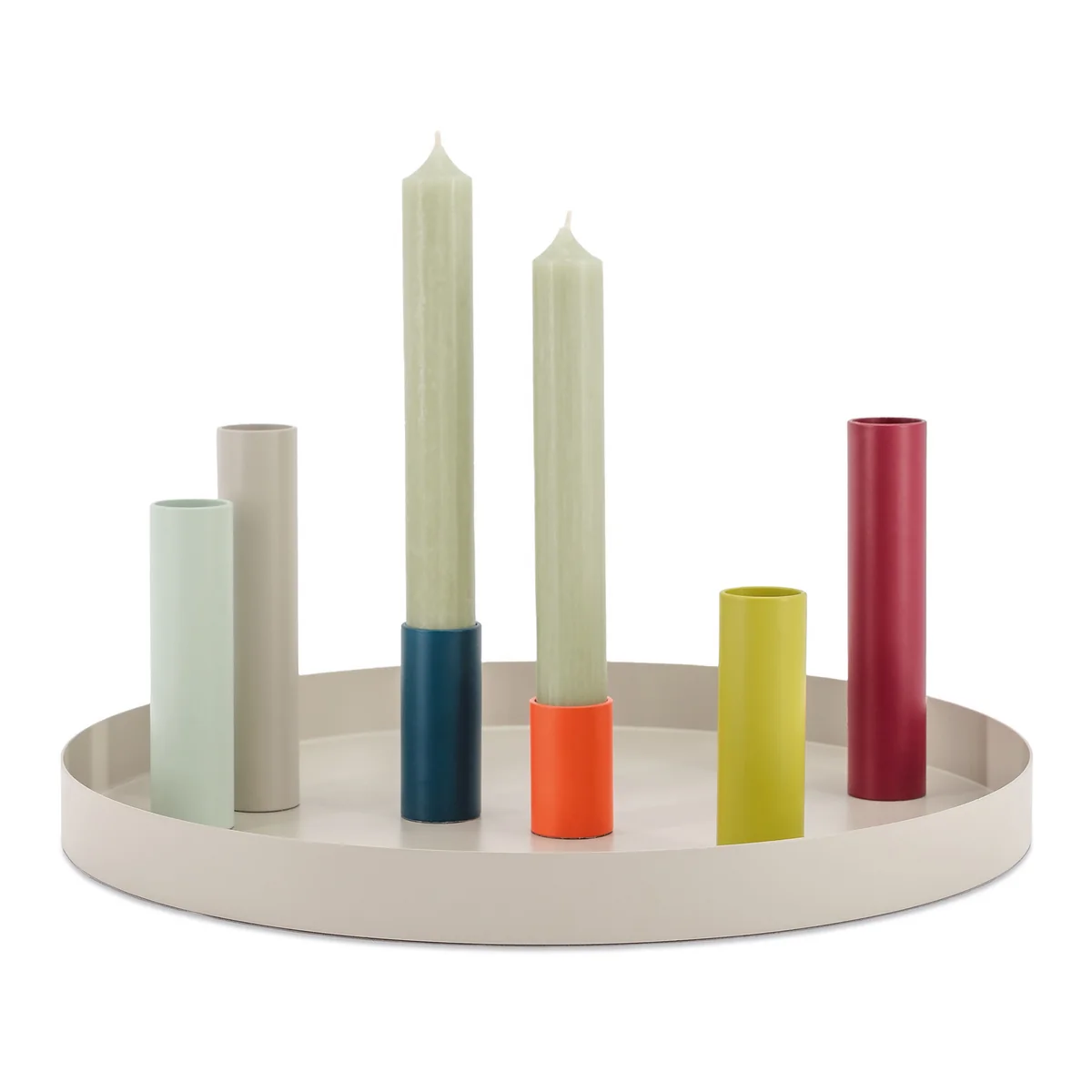 De magnetische kaarsenhouder van Remembar presenteert een rond decoratief dienblad met 6 ronde kaarsenhouders in verschillende maten en kleuren. De kaarsenhouders kunnen naar wens worden geplaatst en herschikt. De set creëert zo een complete opstelling die kan worden aangepast aan het interieur. De kandelaars kunnen worden gedecoreerd met stokkaarsen in verschillende kleuren en lengtes.