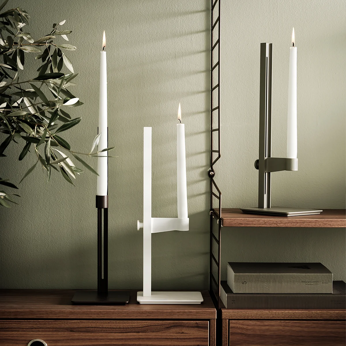 De Museum kandelaar van String is verkrijgbaar in de kleuren wit, donkerbruin en groen.