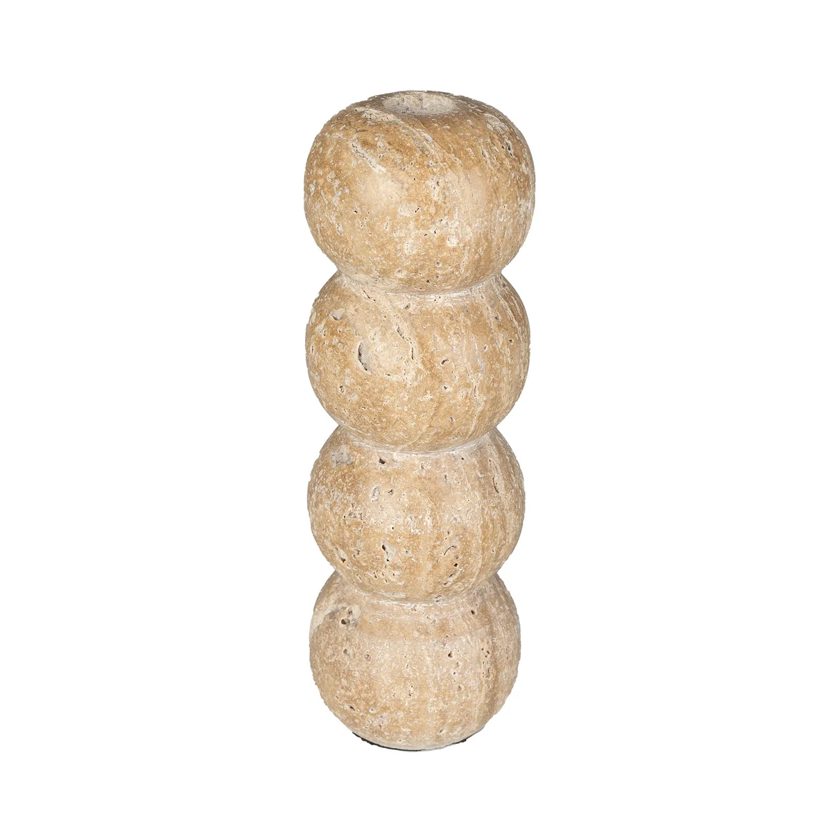 De Rome kandelaar van Zuiver brengt de tijdloze charme van oude architectuur in je moderne huis. Het sculpturale silhouet van vier gestapelde bollen doet denken aan Romeinse zuilen en maakt een stijlvol statement op een dressoir, eettafel of vensterbank. Gemaakt van massief natuursteen - elegant marmer in zwart of wit of warm travertijn - maakt de kandelaar indruk met zijn unieke adering, waardoor elk stuk uniek is. Met een hoogte van 24 cm en een basisoppervlak van 8 × 8 cm is de kandelaar Rome perfect voor klassieke pilaarkaarsen en werkt dankzij zijn gewicht ook als een decoratief object op zichzelf. Het fijn gepolijste oppervlak is gemakkelijk schoon te maken met een droge doek en behoudt lang zijn glans.