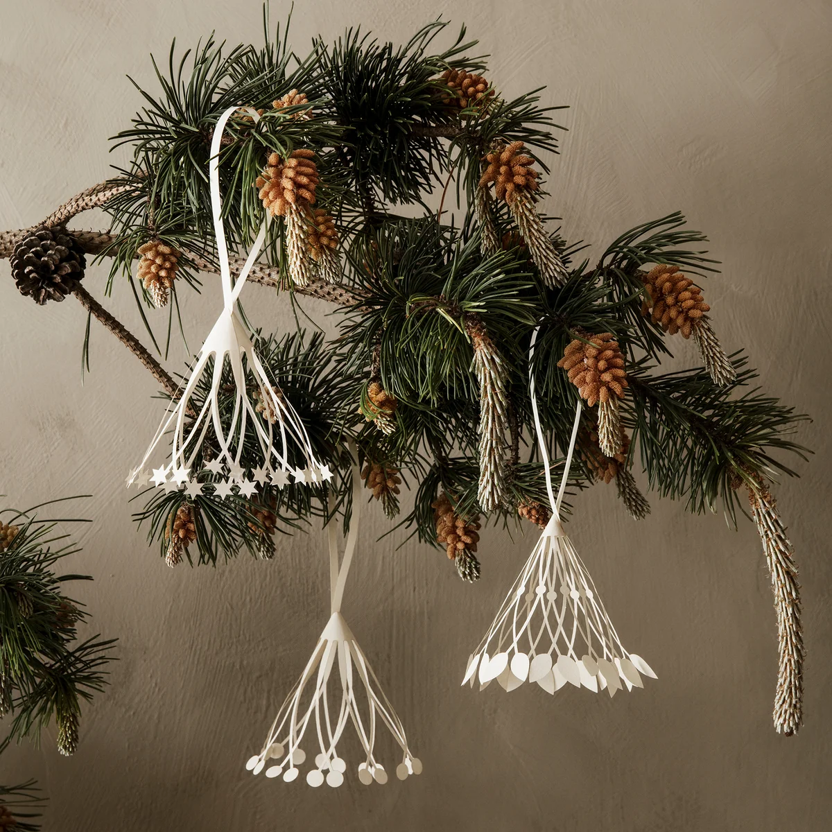 De elegant gevormde papieren hangers van Ferm Living zijn een stijlvol en discreet hoogtepunt in de kerstdecoratie. De sierkegels zijn ontworpen in samenwerking met de Deense kunstenares en architecte Amanda Betz. De filigraanstukken zijn met de laser gesneden en met de hand gevouwen. Ze zijn gemaakt van FSC™-gecertificeerd papier en hebben een mat, glad oppervlak.