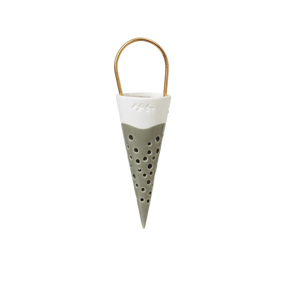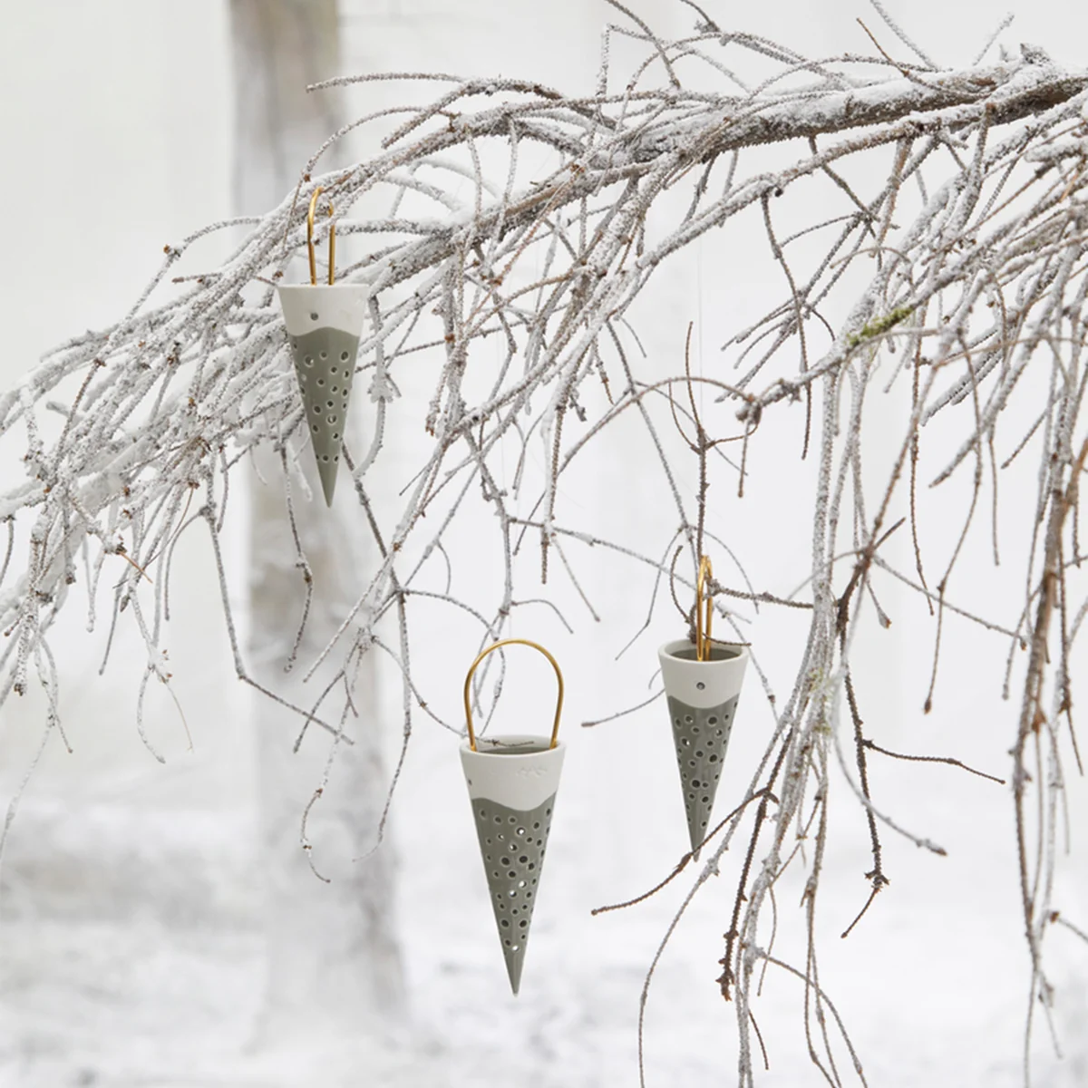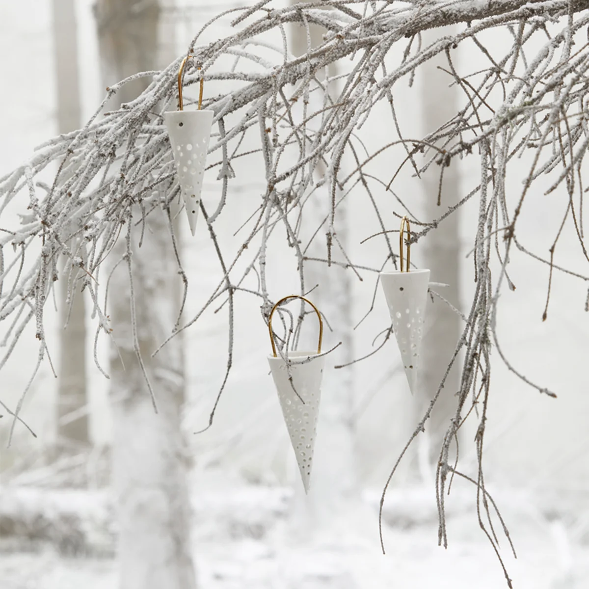 De prachtige Nobili De kerstserie is ontwikkeld om de kerstsfeer op een moderne elegante manier in huiskamers te brengen. Dit jaar doen twee kegels mee aan de serie. De hangende kegels zijn gemaakt van beenderporselein met een glanzend glazuur en glanzend gouden metalen handvat en zijn een perfecte decoratie voor alle kersthuizen.